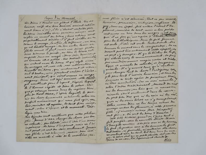 Manuscrit autographe signé traitant de la notion de volonté humaine et sa supériorité face à celle de l'intervention divine en prenant l'exemple de l'Illiade. Dans cette oeuvre, selon Alain, "l'homme s'agite et Dieu mène", le premier étant incapable de prendre en main sa destinée. Il préfère à Homère la légende de Jeanne d'Arc qui "change les choses par bonne volonté, par liberté, sous l'idée d'un devoir impérieux". Il considère cette idée comme un "prodigieux exemple pour tout l'avenir humain" et appelle de ses voeux "ce nouveau miracle [qui est] dans le coeur"; "ce miracle de volonté, ce dangereux miracle" qui redonne à l'humain les clefs de son destin. Les Propos d'Alain ont été publiés presque quotidiennement dans la Dépêche de Rouen entre 1906 et 1914. Celui-ci semble avoir paru en 1911. * Membre du SLAM et de la LILA / ILAB Member. La librairie est ouverte du lundi au vendredi de 14h à 19h. Merci de nous prévenir avant de passer,certains de nos livres étant entreposés dans une réserve.