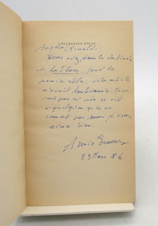 Exemplaire comportant un envoi autographe signé d'Ernaux à Angelo Rinaldi, journaliste français qu'elle remercie de sa critique de La Place qui lui valut le prix Renaudot en 1984. * Membre du SLAM et de la LILA / ILAB Member. La librairie est ouverte du lundi au vendredi de 14h à 19h. Merci de nous prévenir avant de passer,certains de nos livres étant entreposés dans une réserve.