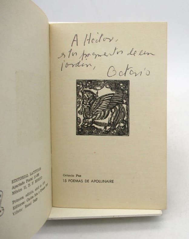 Édition originale de la traduction en espagnol par Octavio Paz des poèmes de Guillaume Apollinaire comportant plusieurs corrections autographes sur le poème "El Puente de Mirebeau". Elle est ornée d'une vignette par Raoul Dufy. Un des 2000 exemplaires tirés, seul tirage annoncé, celui-ci comporte un envoi autographe signé de Paz à Hector Bianciotti, journaliste français. Bon exemplaire. * Membre du SLAM et de la LILA / ILAB Member. La librairie est ouverte du lundi au vendredi de 14h à 19h. Merci de nous prévenir avant de passer,certains de nos livres étant entreposés dans une réserve.