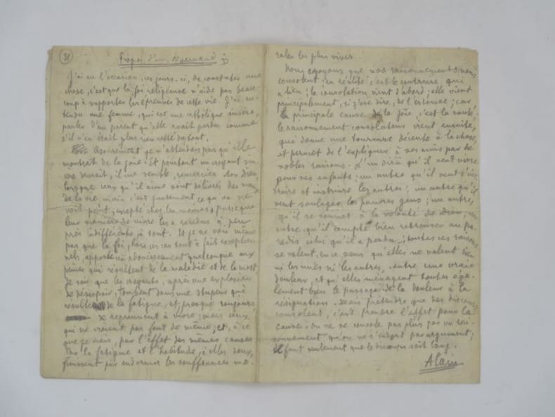 Manuscrit autographe signé dans lequel Alain s'interroge sur les consolations de l'humain face à la mort ou à la douleur. Il souligne qu'il y a, finalement, peu de différence entre le croyant et l'athée. À ce moment de la vie, le premier se tourne vers sa foi, le second vers le raisonnement "qui donne une tournure décente à la chose, et permet de l'expliquer à ses amis". Pour l'auteur, "toutes ses raisons se valent, en ce sens qu'elles ne valent rien ni les unes ni les autres". Elles ne sont qu'un prétexte pour ménager "le passage de la douleur à la résignation". Il conclut "On ne se console pas plus par un raisonnement qu'on ne s'endort par argument; il faut seulement que le discours soit long". Les Propos d'Alain ont été publiés presque quotidiennement dans la Dépêche de Rouen entre 1906 et 1914. Celui-ci semble avoir paru le 27 mai 1907. * Membre du SLAM et de la LILA / ILAB Member. La librairie est ouverte du lundi au vendredi de 14h à 19h. Merci de nous prévenir avant de passer,certains de nos livres étant entreposés dans une réserve.