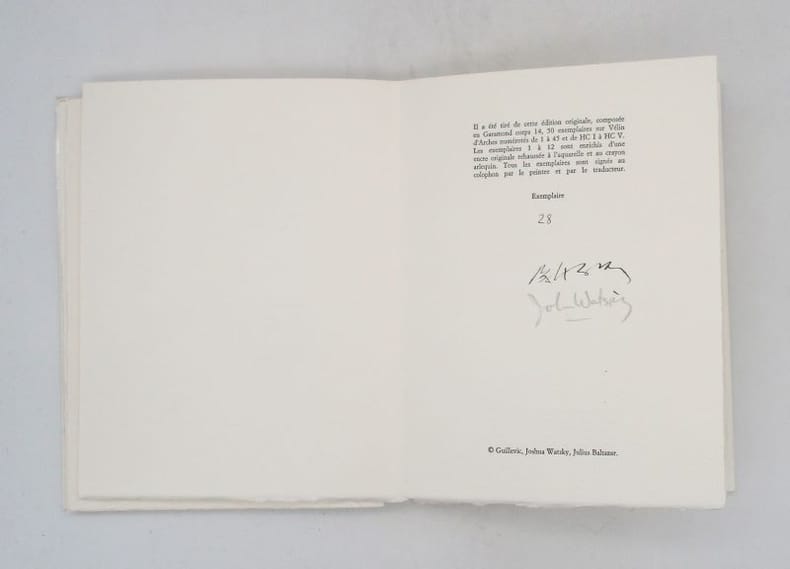 Édition originale de la traduction française par Joshua Watsky ornée de 6 lithographies en noir de Julius Baltazar. Un des 50 exemplaires sur vélin d'Arches, signé à la justification par l'auteur et l'artiste, celui-ci comporte un envoi autographe signé de l'artiste à Jean Cortot. Bon exemplaire. * Membre du SLAM et de la LILA / ILAB Member. La librairie est ouverte du lundi au vendredi de 14h à 19h. Merci de nous prévenir avant de passer,certains de nos livres étant entreposés dans une réserve.