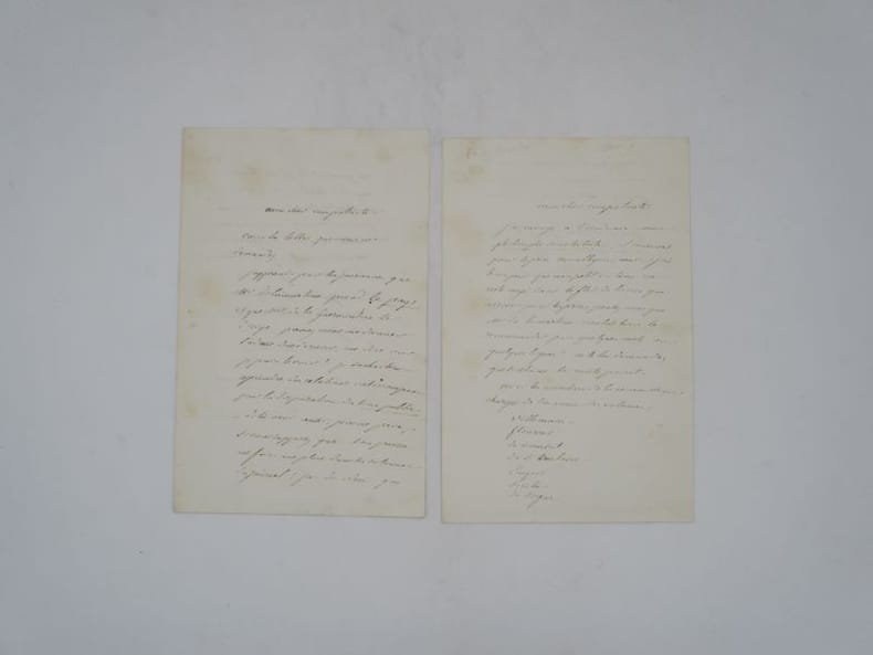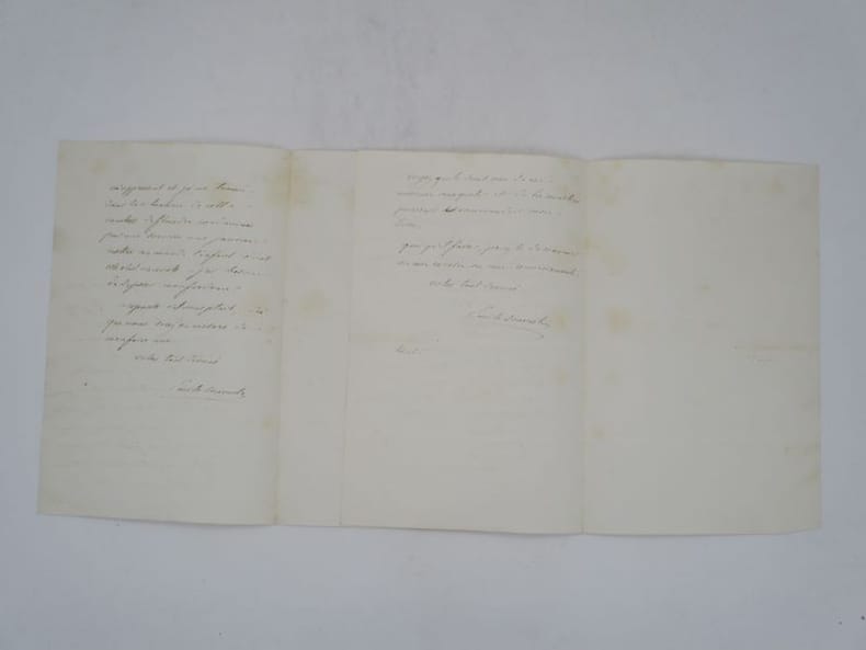 2 lettres autographes signées : 1- Lettre autographe signée à "Mon cher compatriote". S.l.n.d. In-8, 2 pp. Souvestre demande de l'aide pour se faire embaucher pour écrire sur "une comtesse de Flandres condamnée par une sorcière à ne jamais mettre au monde l'enfant dont elle est enceinte". Il évoque Lamartine. 2- Lettre autographe signée à "Mon cher compatriote". S.l.n.d. In-8, 1 p. 1/2. Il a envoyé son ouvrage Le Philosophe sous les toits pour le prix Montyon et demande si son correspondant peut en toucher un mot à Lamartine ou aux autres juges dont il donne le nom. Il fut finalement lauréat du prix de l'Académie française en 1864 pour cette oeuvre. * Membre du SLAM et de la LILA / ILAB Member. La librairie est ouverte du lundi au vendredi de 14h à 19h. Merci de nous prévenir avant de passer,certains de nos livres étant entreposés dans une réserve.