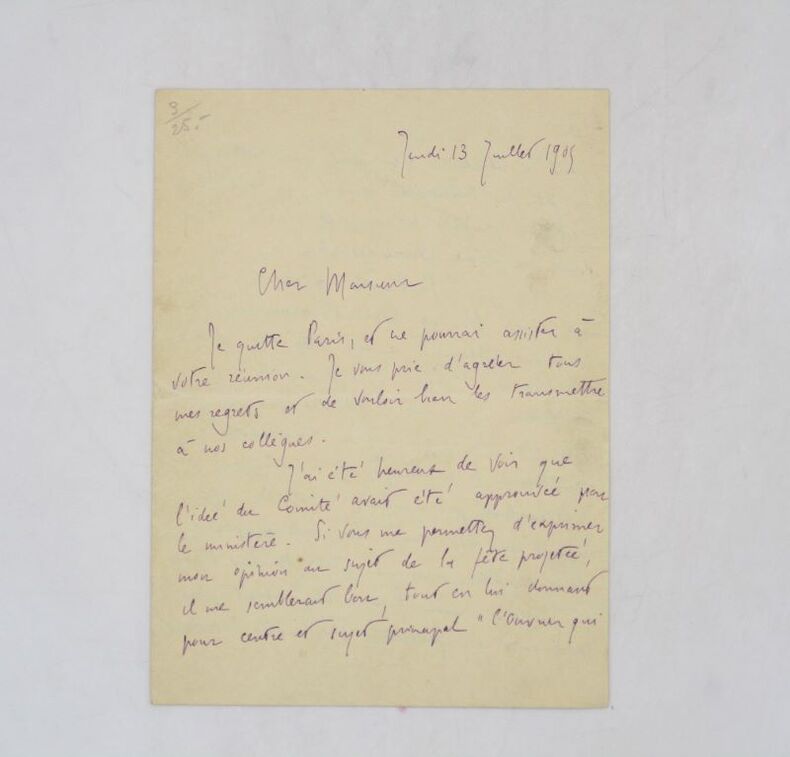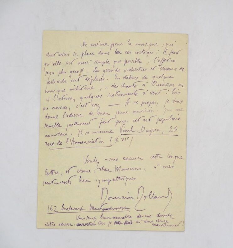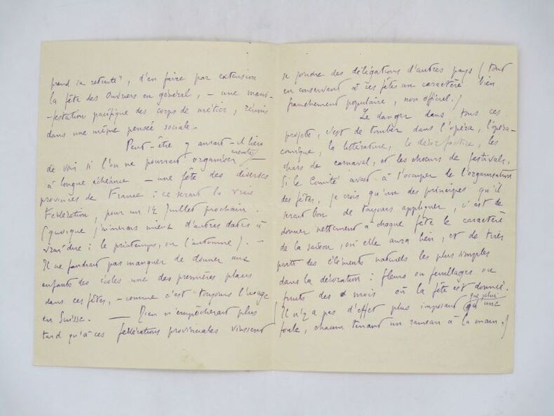 Lettre autographe signée à un destinataire non identifié qu'il entretient de la création d'une fête des ouvriers : "une manifestation pacifique des corps de métiers, réunis par une même pensée sociale.". Il propose également une "fête des diverses provinces de France", le 14 juillet comme une "vraie Fédération". Il s'inquiète néanmoins que ces projets tombent "dans l'opéra, l'opéra-comique, la littérature, le décor factice, les chars de carnaval, et les choeurs de festival." Il propose de ne pas oublier la musique et met en avant Paul Dupin "mon jeune musicien" qu'il fit connaître avec une critique élogieuse dans la revue de la Société Internationale de Musique du 15 décembre 1908. * Membre du SLAM et de la LILA / ILAB Member. La librairie est ouverte du lundi au vendredi de 14h à 19h. Merci de nous prévenir avant de passer,certains de nos livres étant entreposés dans une réserve.