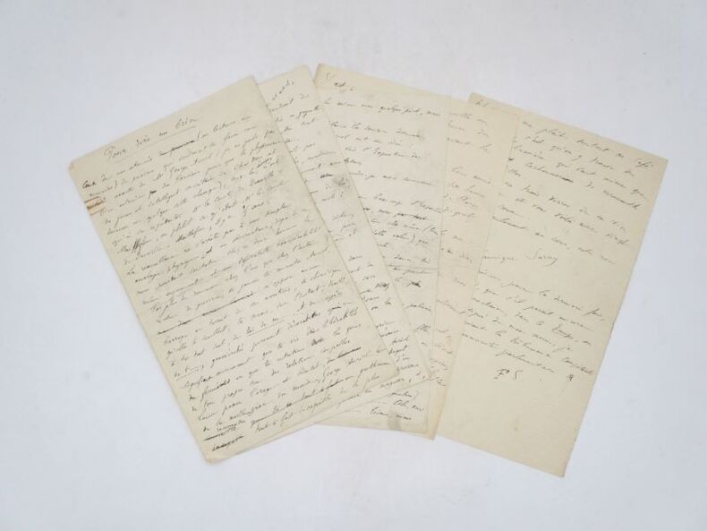 Manuscrit autographe signé partiel de ce portrait à l'acide de Georges Auriol qu'il compare au "comte de Douville-Maillefeu", à un homme qui "ne conçoit pas qu'il puisse exister des barrières sociales" dont le "passe-temps favori" et de "bombarder sans trêve" de lentilles "les chapeaux des passants". Il évoque quelques anecdotes qu'il a vécu avec Auriol à un exposition d'artistes féminines. Ce texte a paru en une dans le numéro du Chat noir du samedi 2 mars 1889. On joint un manuscrit autographe du même dont il manque les 4 premiers feuillets à propos de ses fréquentations au Café de Paris (2 pp. in-8) qui ne semble pas avoir paru dans la même revue. * Membre du SLAM et de la LILA / ILAB Member. La librairie est ouverte du lundi au vendredi de 14h à 19h. Merci de nous prévenir avant de passer,certains de nos livres étant entreposés dans une réserve.