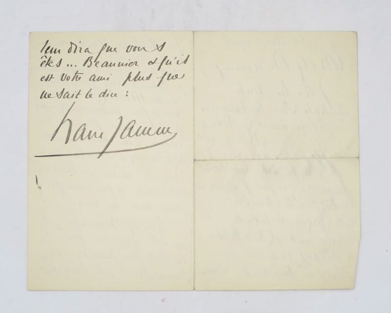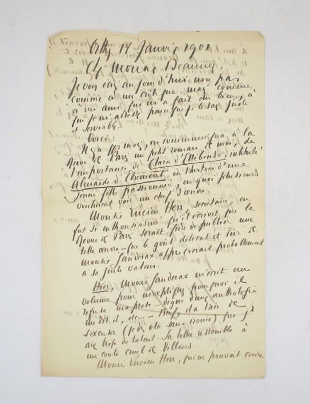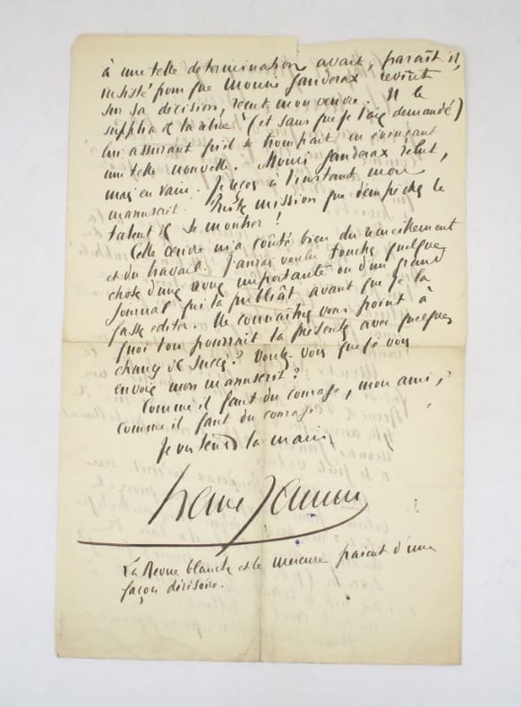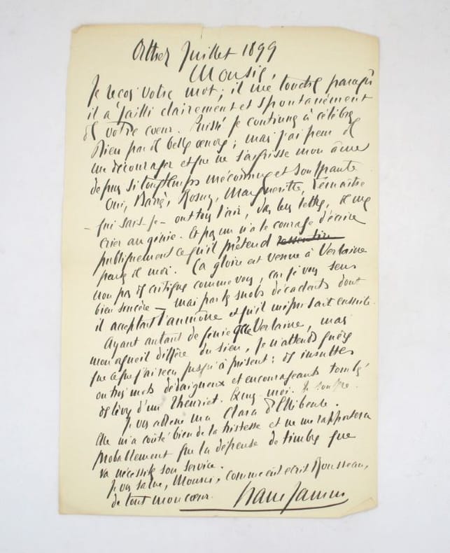 4 lettres autographes signées : 1- Orthez, juillet 1899. In-folio, 1 p. à un critique non identifié auquel il explique que "Barrès, Rosny, Margueritte, Lemaître [...] ont tous l'air [...] de me crier au génie. Et pas un n'a le courage d'écrire publiquement ce qu'il prétend penser de moi." "Ayant autant de génie que Verlaine, mais mon orgueil diffère du sien, je n'attends guère que ce que j'ai reçu jusqu'à présent : des insultes ou trois mots dédaigneux et encourageant [...] d'un Thieuret." 2- Orthez, 18 janvier 1901. In-folio, 2 pp. à André Beaunier, critique littéraire et romancier français à qui il demande dans quelle revue littéraire il pourrait faire paraître son Almaïde d'Entremont avant une édition en volume. Il se plaint de la mauvaise réception de son ouvrage par Charles Louis Ganderax, directeur littéraire à la Revue de Paris malgré l'avis positif et l'insistance de Lucien Herr, secrétaire à la même revue. 3- Orthez, Avril 1901. In-folio, 1 p. à André Beaunier auquel il demande des nouvelles pour son son Almaïde d'Entremont qu'il souhaite publier en revue. Il lui envoie son Deuil des primevères dans lequel se trouve le dialogue en vers La Jeune Fille nue. 4- S.l. 30 avril 1903. In-12, 2 pp. 1/2 à Deaunier qu'il remercie chaleureusement pour sa critique du Roman du lièvre, il apprécie tout particulièrement "cette fidèle sincérité, cette façon délicate et charmante de se répéter à propos comme une fleur sûre au printemps qu'elle fera plaisir". Il affirme que si un jour Beaunier frappe "à la porte du parados des jeunes filles, le lièvre leur dira que vous êtes ... Beaunier et qu'il est votre ami". * Membre du SLAM et de la LILA / ILAB Member. La librairie est ouverte du lundi au vendredi de 14h à 19h. Merci de nous prévenir avant de passer,certains de nos livres étant entreposés dans une réserve.