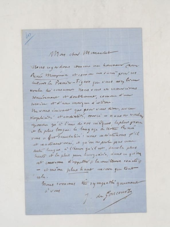 Lettre autographe signée à Monselet qu'il remercie de sa critique élogieuse dans le Figaro du roman Renée Maupérin. Il répond à l'une de ses remarques à propos du langage de Renée que Monselet trouve scandaleux mais lui assure que c'est ainsi que l'on parle "dans la plus haute et plus pure bourgeoisie, dans ce qu'on est convenu d'appeler la meilleure société". La critique de Monselet a paru le 3 avril 1864. * Membre du SLAM et de la LILA / ILAB Member. La librairie est ouverte du lundi au vendredi de 14h à 19h. Merci de nous prévenir avant de passer,certains de nos livres étant entreposés dans une réserve.