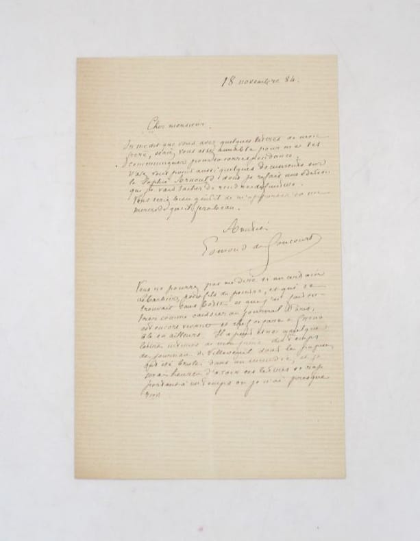 Lettre autographe signée à un destinataire non identifié à qui il demande des lettres de son frère Jules pour publier sa correspondance. Il lui demande également s'il a des documents concernant Sophie Arnould dont il veut faire une édition définitive et s'enquiert d'un homme qui pourrait posséder des lettres de son frère. * Membre du SLAM et de la LILA / ILAB Member. La librairie est ouverte du lundi au vendredi de 14h à 19h. Merci de nous prévenir avant de passer,certains de nos livres étant entreposés dans une réserve.