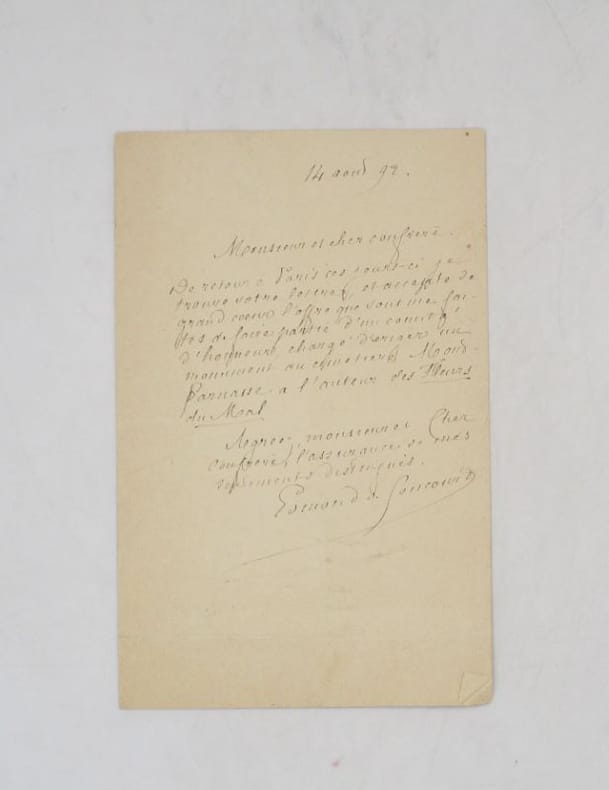 Lettre autographe signée à un destinataire non identifié. L'aîné des Goncourt accepte de faire parti d'un comité pour l'érection d'un monument à la gloire de Charles Baudelaire au cimetière de Montparnasse. Le président de ce comité n'était autre que Leconte de Lisle et il fallut pas moins de dix ans avant l'installation de ce cénotaphe sculpté par José de Charmoy. * Membre du SLAM et de la LILA / ILAB Member. La librairie est ouverte du lundi au vendredi de 14h à 19h. Merci de nous prévenir avant de passer,certains de nos livres étant entreposés dans une réserve.