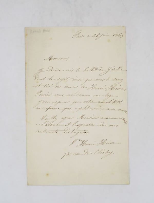 Lettre autographe signée probablement à un directeur de théâtre pour demander une loge pour Giselle. Un ballet dont le livret provient de l'argument suggéré par Théophile Gautier au librettiste Henri Vernoy de Saint-Georges et qui s'inspire de l'ouvrage De lAllemagne d'Heinrich Heine, son époux, déjà décédé à l'époque de la lettre. * Membre du SLAM et de la LILA / ILAB Member. La librairie est ouverte du lundi au vendredi de 14h à 19h. Merci de nous prévenir avant de passer,certains de nos livres étant entreposés dans une réserve.