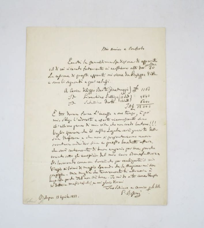 Bologne, 15 avril 1851. In-4, 1 p. (petites déchirures marginales sans atteinte, quelques taches, un petit manque sans atteinte).