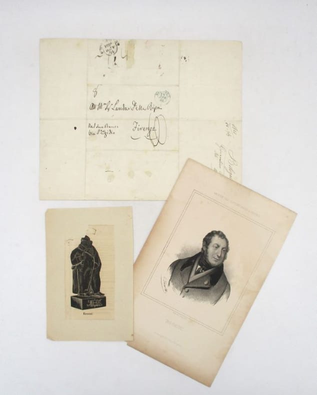 Lettre autographe signée à Laudadio della Ripa, ami de Rossini et banquier florentin à qu'il entretient de problème de succession et de son prochain voyage à Florence. Il termine sa missive sur la jolie formule "Io mi do ate come Fausto si dette a Mefistofeles" (je me donne à toi comme Faust à Méphistophélès). On joint deux portraits du musicien (le plus petit avec un gros manque). * Membre du SLAM et de la LILA / ILAB Member. La librairie est ouverte du lundi au vendredi de 14h à 19h. Merci de nous prévenir avant de passer,certains de nos livres étant entreposés dans une réserve.