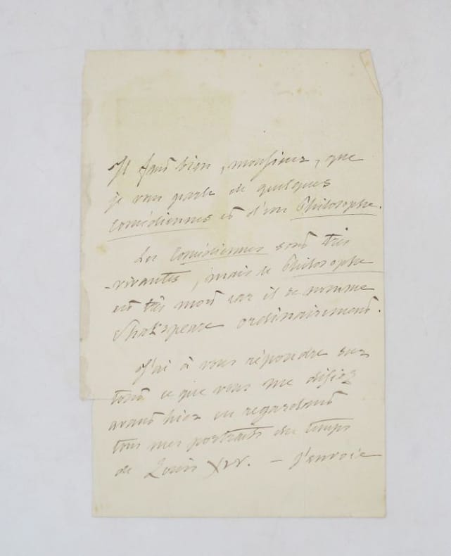 Lettre autographe signée à un destinataire non identifié auquel il souhaite parler de comédiennes "très-vivantes" et d'un philosophe "très mort car il se nomme Shakespeare". * Membre du SLAM et de la LILA / ILAB Member. La librairie est ouverte du lundi au vendredi de 14h à 19h. Merci de nous prévenir avant de passer,certains de nos livres étant entreposés dans une réserve.