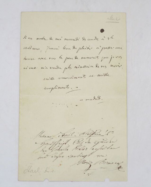 Lettre autographe à Madame Pickles qu'elle souhaite voir "ce mercredi des Cendres". Dans la partie inférieure se trouve une note manuscrite signée Moriz Berman. * Membre du SLAM et de la LILA / ILAB Member. La librairie est ouverte du lundi au vendredi de 14h à 19h. Merci de nous prévenir avant de passer,certains de nos livres étant entreposés dans une réserve.