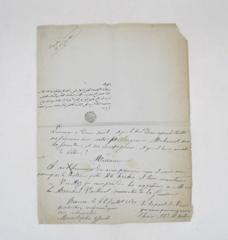 Lettre autographe en arabe signée du Tugra (sceau) de l'émir avec sa traduction française certifiée et signée par Moustapha Effendi. S'adressant à un destinataire non identifié, il le prévient de l'envoi de 20 brebis et 3 moutons à expédier au maréchal Jean-Baptiste Philibert Vaillant, ministre de la guerre de 1854 à 1859. * Membre du SLAM et de la LILA / ILAB Member. La librairie est ouverte du lundi au vendredi de 14h à 19h. Merci de nous prévenir avant de passer,certains de nos livres étant entreposés dans une réserve.