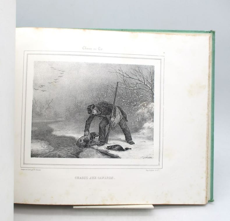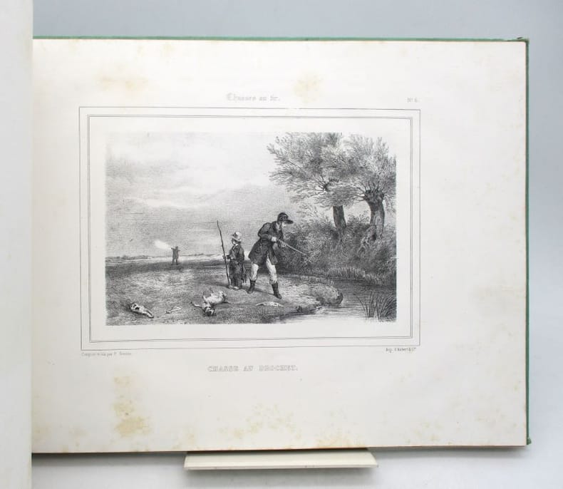 Édition en partie originale de cet album peu commun. Il est composé de 33 planches en noir de scènes de chasse, toutes dessinées et lithographiées par Grenier avec leur légende. Les douze premières planches sont les mêmes que celles publiées dans "Douze sujets de chasses au tir", paru en 1929. La onzième a été remplacée par une planche intitulée "Le Retour du chasseur". Thiébaud, 476 : " plus bel album de Grenier ". * Membre du SLAM et de la LILA / ILAB Member. La librairie est ouverte du lundi au vendredi de 14h à 19h. Merci de nous prévenir avant de passer,certains de nos livres étant entreposés dans une réserve.