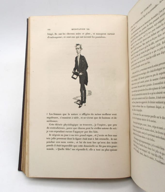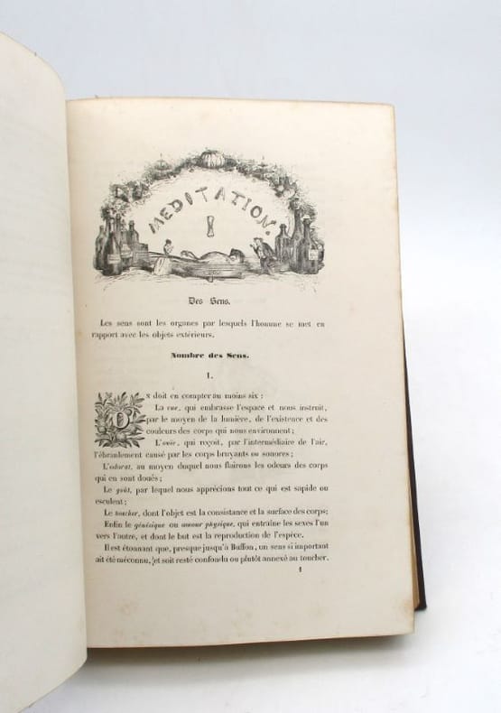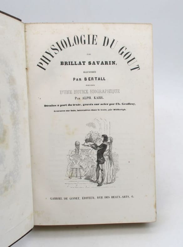 Elle fut imprimée aux frais de l'auteur à 500 exemplaires et mis dans le commerce en décembre 1825. Brillat-Savarin, qui décède moins de deux mois après la parution du volume, n'aura guère eu le temps de profiter du succès de son grand oeuvre. Inutile de revenir sur l'importance et l'histoire de l'œuvre que nous pourrons cependant agrémenter d'un jugement catégorique et déglaçant d'un de ses illustres lecteurs, quelques années plus tard : « Un homme très célèbre, qui était en même temps un grand sot, choses qui vont très bien ensemble [...] a osé, dans un livre sur la Table, [...] écrire ce qui suit à l'article VIN : ‘Le patriarche Noé passe pour être l'inventeur du vin ; c'est une liqueur qui se fait avec le fruit de la vigne.' Et après ? Après, rien : c'est tout. Vous aurez beau feuilleter le volume, le retourner dans tous les sens, le lire à rebours, à l'envers, de droite à gauche et de gauche à droite, vous ne trouverez pas autre chose sur le vin dans la Physiologie du goût du très illustre et très respecté Brillat-Savarin : ‘Le patriarche Noé...' et ‘c'est une liqueur...'. Je suppose qu'un habitant de la lune ou de quelque planète éloignée, voyageant sur notre monde, et fatigué de ses longues étapes, pense à se rafraîchir le palais et à se réchauffer l'estomac. Il tient à se mettre au courant des plaisirs et des coutumes de notre terre. Il a vaguement ouï parler de liqueurs délicieuses avec lesquelles les citoyens de cette boule se procuraient à volonté du courage et de la gaieté. Pour être plus sûr de son choix, l'habitant de la lune ouvre l'oracle du goût, le célèbre et infaillible Brillat-Savarin, et il y trouve, à l'article VIN, ce renseignement précieux : ‘Le patriarche Noé'... et ‘cette liqueur se fait'... Cela est tout à fait digestif. Cela est très explicatif. Il est impossible, après avoir lu cette phrase, de n'avoir pas une idée juste et nette de tous les vins, de leurs différentes qualités, de leurs inconvénients, de leur puissance sur l'estomac et sur le cerveau. Ah ! chers amis, ne lisez pas Brillat-Savarin. Dieu préserve ceux qu'il chérit des lectures inutiles ; c'est la première maxime d'un petit livre de Lavater, un philosophe qui a aimé les hommes plus que tous les magistrats du monde ancien et moderne. On n'a baptisé aucun gâteau du nom de Lavater ; mais la mémoire de cet homme angélique vivra encore parmi les chrétiens, quand les braves bourgeois eux-mêmes auront oublié le Brillat-Savarin, espèce de brioche insipide dont le moindre défaut est de servir de prétexte à une dégoisade de maximes niaisement pédantesques tirées du fameux chef-d'oeuvre ». Costard trois étoiles et triple fourchette signés Charles Baudelaire (in Les Paradis artificiels, « Du Vin »). N'en déplaise à Baudelaire, La Physiologie du goût est « un des chefs-d'oeuvre de la littérature gastronomique mondiale. Il est, avec Grimod de la Reynière, celui qui a le plus sérieusement médité sur l'art transcendantal du bien-manger » (Oberlé). Bel exemplaire ; rare en reliure d'époque et de qualité, comme ici.