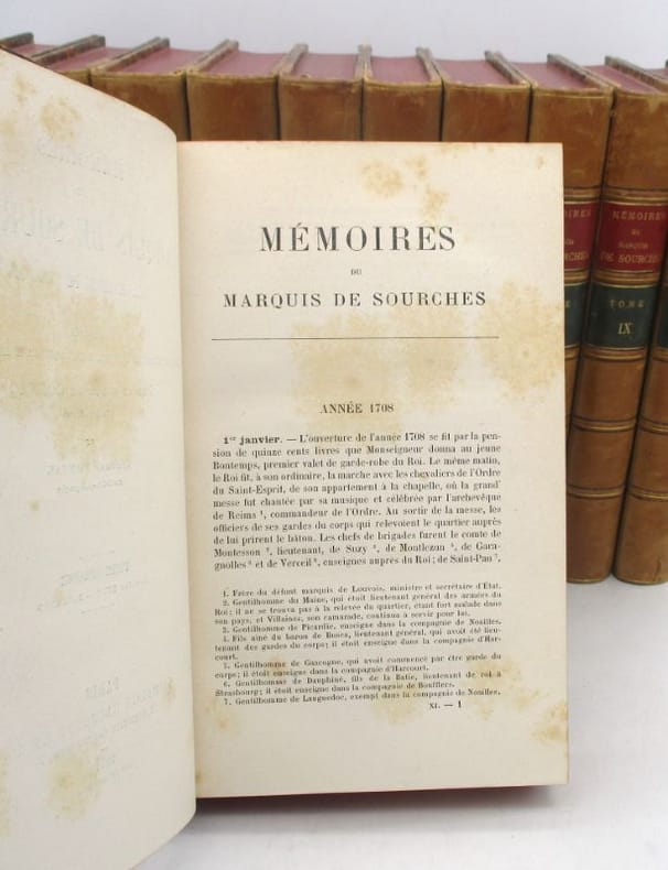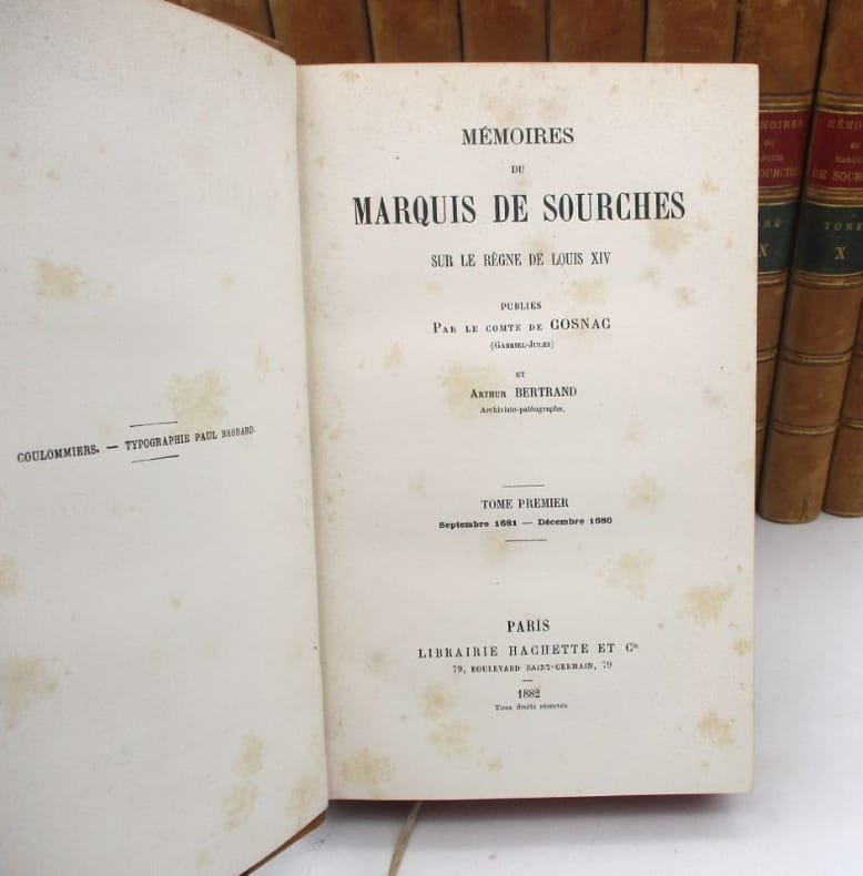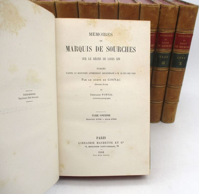 Édition établie par le comte de Cosnac, Arthur Bertrand et Édouard Pontal s'étendant sur la période de septembre 1681 à juin 1709. Le marquis de Sourches était Grand Prévôt de France, soit officier de la police de Cour avec juridiction sur les militaires de la Maison du Roi. * Membre du SLAM et de la LILA / ILAB Member. La librairie est ouverte du lundi au vendredi de 14h à 19h. Merci de nous prévenir avant de passer,certains de nos livres étant entreposés dans une réserve.