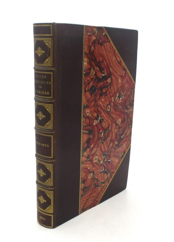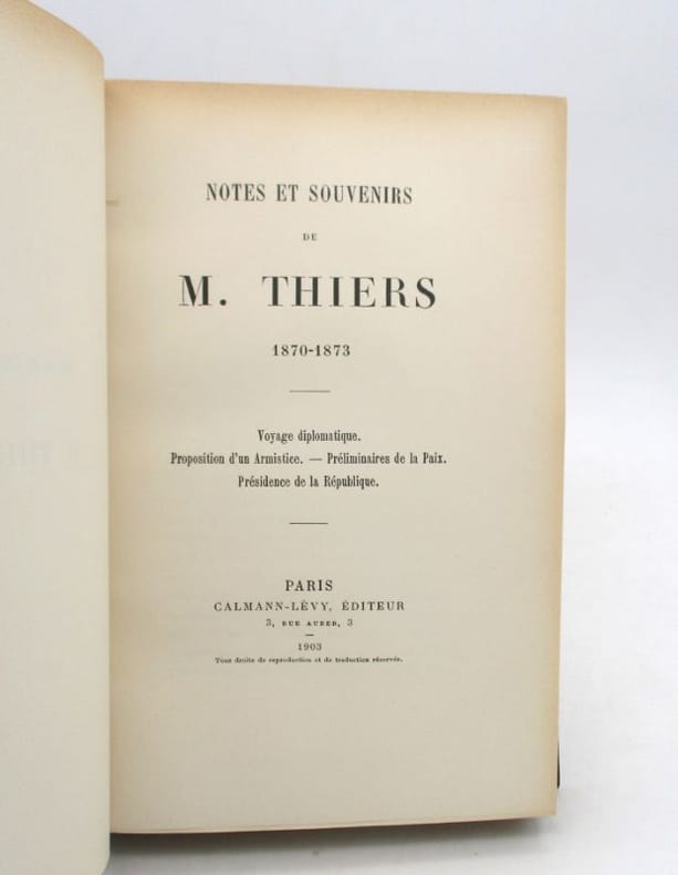 Rare et très bel exemplaire, en parfait état, de l'édition originale, publiée hors commerce en 1901, sur beau papier vergé, par les soins de la belle-soeur d'Adolphe Thiers, Félicie Dosne (1823-1906). L'ouvrage est important pour la connaissance approfondie de cette période instable de l'histoire de France, notamment à propos des négociations de Thiers avec Bismarck. Il est découpé en quatre parties : Voyage diplomatique (1870), Négociations pour un armistice (octobre 1870), Préliminaires de la Paix (1871), et Présidence de la République (1871-1873), et suivi d'Annexes.