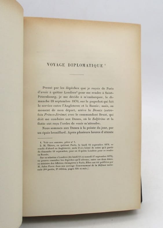 Ouvrage important pour la connaissance de cette période mouvementée de l'histoire de France, notamment à propos des négociations de Thiers avec Bismarck : Voyage diplomatique - Proposition d’un armistice - Préliminaires de la paix - Présidence de la République. Bon état d’occasion