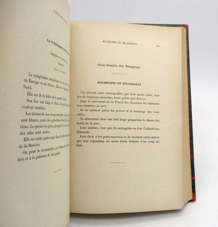 Ouvrage orné de 125 gravures d'après nature, par Emile Thivier, Maurice Moisand et par l'auteur, 1 vol. in-8 reliure de l'époque demi-vélin blanc, Nos oiseaux de mer, de rivière et de marais, Réimprimé par MM. Emonet, Dupuy et Cie, Publié par Firmin-Didot et Cie, Paris, 1877-1922, XV-523 pp.