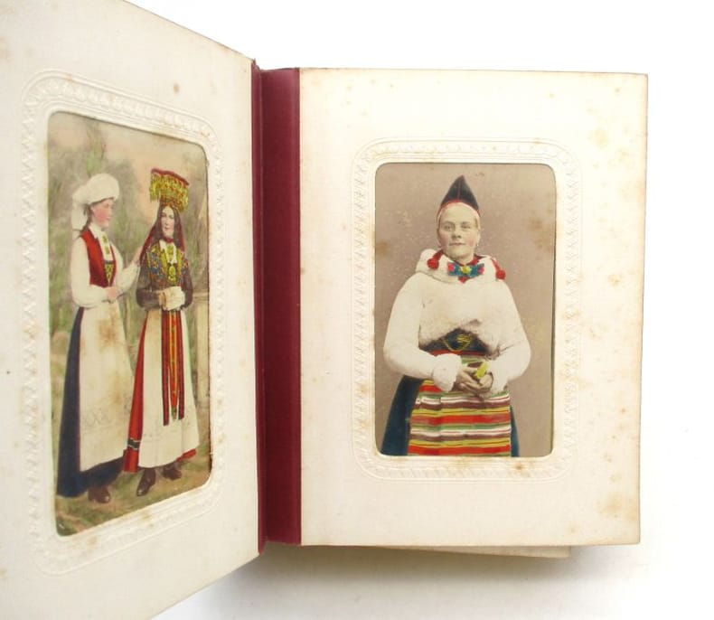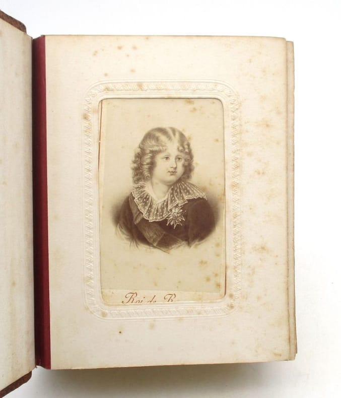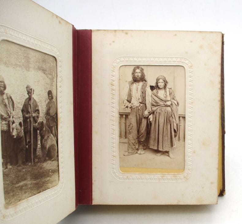 Album de photographies regroupant trois clichés reproduisant des gravures de portraits du Roi de Rome, fils de Napoléon Ier et deux femmes du XVIIIe siècle : madame Élisabeth,soeur de Louis XVI et une seconde non identifiée; six clichés rehaussés de couleurs représentant des costumes traditionnels des Pays-Bas et deux provenant de Laponie; vingt-et-un clichés en noir et blanc de costumes traditionnels du Caucase et du Daghestan; 2 clichés de costumes féminins du Pays de Galles, un portrait de marin rehaussé en couleurs; quatre scènes religieuses chrétiennes; la reproduction d'un tableau représentant de la rencontre entre St Jean-Baptiste, l'Enfant Jésus et leurs mères respectives; enfin deux clichés reproduisant une caricature de A. Sola, datée sur la planche de 1889 à Berlin. * Membre du SLAM et de la LILA / ILAB Member. La librairie est ouverte du lundi au vendredi de 14h à 19h. Merci de nous prévenir avant de passer,certains de nos livres étant entreposés dans une réserve.