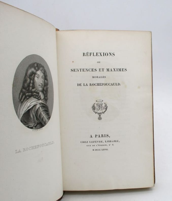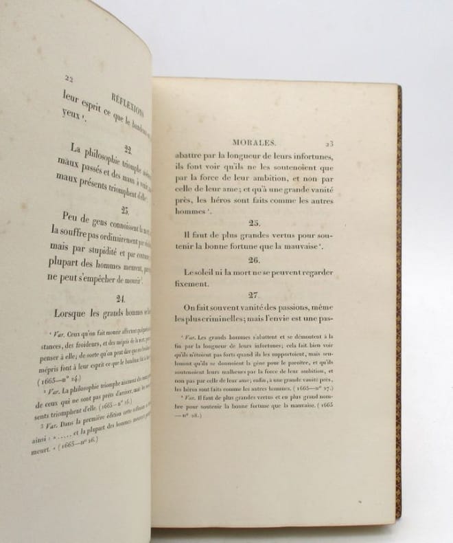 1 volume in-8 (20,3 x 12,7 cm), demi-veau rouge (reliure de l’époque), dos lisse orné de filets et fers à froid. viii-221-1 bl.-[4]-140 pages (complet). Dos légèrement insolé, rares rousseurs. Bon état. Nouvelle édition intéressante incluant les pensées supprimées par l’auteur, les pensées tirées des lettres manuscrites qui se trouvent à la Bibliothèque du Roi et l’ÉDITION ORIGINALE de l’Examen critique de Louis-Aimé Martin. Édition illustrée d’un portrait-frontispice par Bertonnier d’après Petitot. Parues pour la première fois en 1664 chez Barbin, les Maximes de La Rochefoucauld (1613-1680) ont permis la transmission du charme des salons. Bon exemplaire.