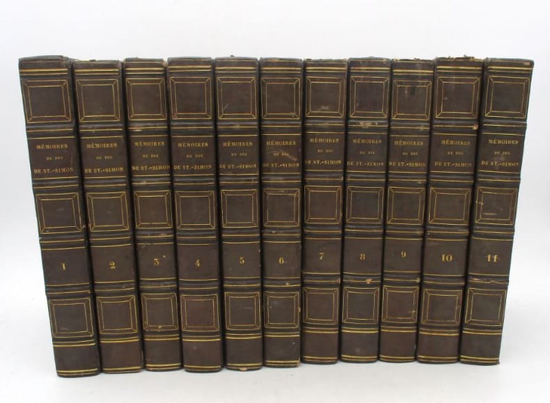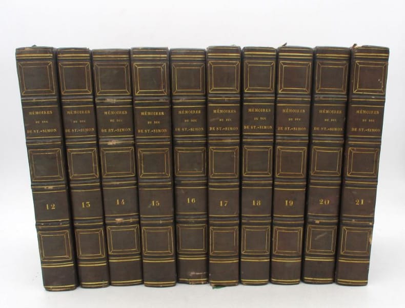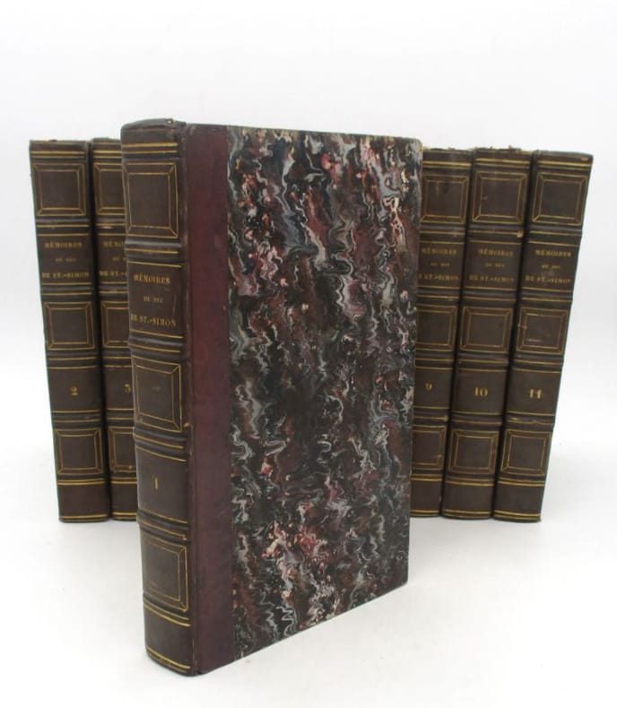 Titre complet « Mémoires complets et authentiques du Duc de Saint-Simon sur le Siècle de Louis XIV et la Régence » collationnés sur le Manuscrit original par M. Chéruel, édités entre 1856 et 1858 par Hachette et précédés d’une notice par M. Sainte-Beuve. Reliure demi cuir à coins bordeaux, contreplats et tranches jaspés, motifs de couleurs vives évoquant des plumes. Sur le rempli du premier tome est inscrit en lettres dorées le nom du libraire Auguste Fontaine, fondateur de la librairie Fontaine créée en 1834. Dos à 5 nerfs, titrage, tomaison et fer dorés. Gravure en frontispice sous serpente représentant Louis Duc de Saint-Simon dessiné par Fath d’après un portrait authentique. Le volume 18 contient un fac-similé d’une partie du manuscrit autographe de Saint-Simon ayant pour sujet les Mémoires de Dangeau. Le volume 20 comporte une photographie d’un extrait de l’original du testament olographe de Saint-Simon et une table alphabétique des matières et des noms propres contenus dans les Mémoires. Coins frottés, ainsi que bords et coiffes par endroits. Rousseurs dans les pages légèrement gondolées. Des feuilles écornées aux volumes 2 et 12. Petit accroc dans le haut de certaines pages du volume 10. Signets (sauf volumes 11, 14 et 18).