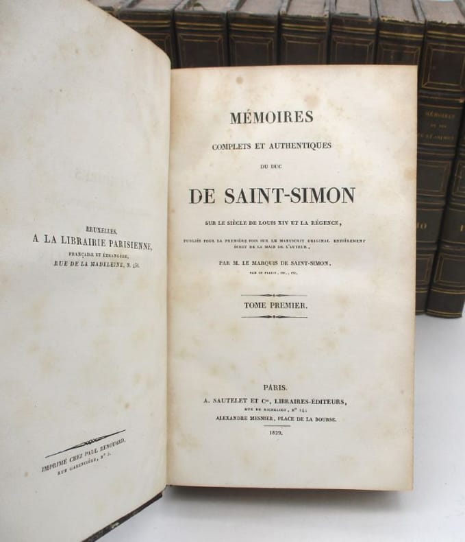 Titre Complet : "Mémoires Complets et authentiques du Duc De Saint Simon sur le siècle de Louis XIV et la Régence, collationnés sur le manuscrit original par M.Cheruel et précédés d'une notice par M. Sainte Beuve" Les volumes proviennent de tirages différents et à l'identique, la plupart portant la date de 1884 - Il faut savoir que cette "petite édition"( voir les 20 volumes de l'édition In Octavo que celle-ci complète ) de la version de Chéruel à connu 15 Tirages entre 1856 et 1914 . Ensemble complet mais disparate dans l'état des volumes. L'ensemble est propre et sain. Bon Etat Franco de port France jusqu'à 29 euros iclus. PAYPAL immédiat. MONDIAL RELAY pour : FRANCE, Portugal, Pologne, Espagne, Allemagne, Autriche, Pays Bas, Luxembourg, Italie, Belgique. Toutes les étapes sont accompagnées. Achat, estimations et listages (Papiers, Archives, monographies, arts et métiers, sciences humaines et bibliophilie) France / Suisse (sur rdv).