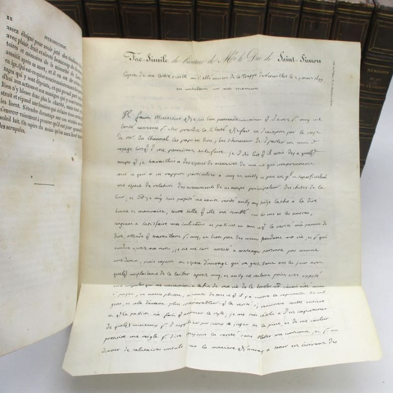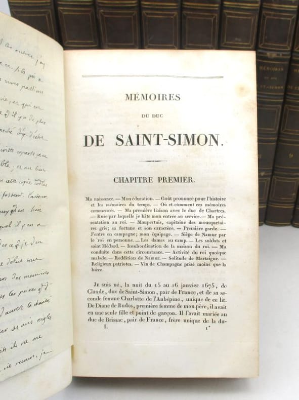 Première édition complète des célèbres Mémoires, établie par le marquis de Saint-Simon. Elle comprend un portrait de l'auteur en frontispice du 20e volume et le grand plan dépliant de la grande chambre du Parlement de Paris au 11e. Le manuscrit original du texte avait été saisi par le duc de Choiseul au décès de l'auteur et divers extraits en avaient été publiés. Ce fut finalement Louis XVIII qui les rendit à la famille, ce qui permit la présente parution. Elle fit grand bruit à son époque et entraîna de nombreuses rééditions et traductions. * Membre du SLAM et de la LILA / ILAB Member. La librairie est ouverte du lundi au vendredi de 14h à 19h. Merci de nous prévenir avant de passer,certains de nos livres étant entreposés dans une réserve.