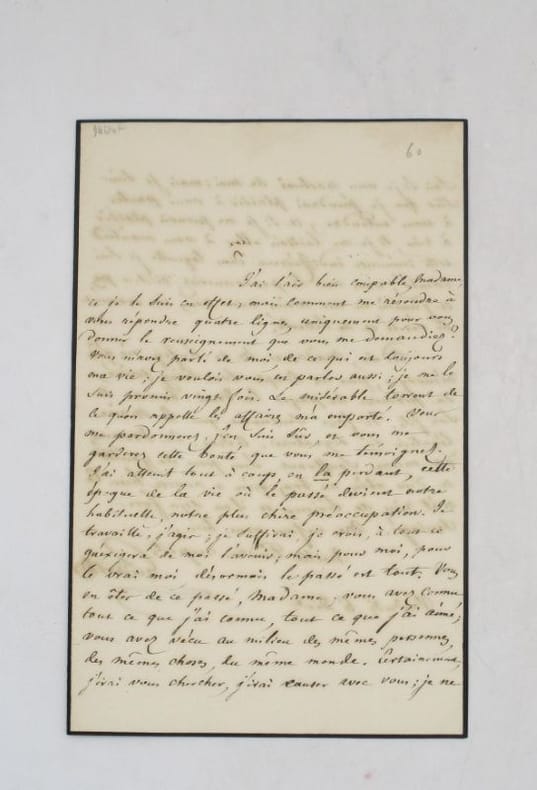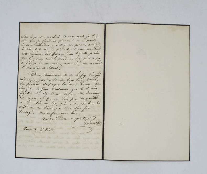Émouvante lettre autographe signée à une dame non identifiée dans laquelle il semble évoquer la perte de son épouse. Il explique s'être trouvé à "cette époque de la vie où le passé devient notre habituelle, notre plus chère préoccupation" et que "pour moi, pour le vrai moi, désormais le passé est tout". Guizot eut deux épouses au cours de sa vie : Pauline de Meulan, décédée en 1827 et Élisa Dillon, nièce de la précédente, décédée en 1833. La destinataire de la lettre a connu cette épouse : "Vous en êtes de ce passé, madame; vous avez connu tout ce que j'ai connu, tout ce que j'ai aimé; vous avez vécu au milieu des mêmes personnes, des mêmes choses, du même monde." Il se tourne vers elle pour partager sa peine et souhaite avoir avec elle "un moment de vérité et de liberté". Il conclut la lettre sur la bonne santé de ses enfants, ce qui laisse à penser qu'il doit donc s'agir de sa seconde épouse Élisa Dillon puisque seul un fils survit à Pauline de Meulan. Belle lettre personnelle. * Membre du SLAM et de la LILA / ILAB Member. La librairie est ouverte du lundi au vendredi de 14h à 19h. Merci de nous prévenir avant de passer,certains de nos livres étant entreposés dans une réserve.