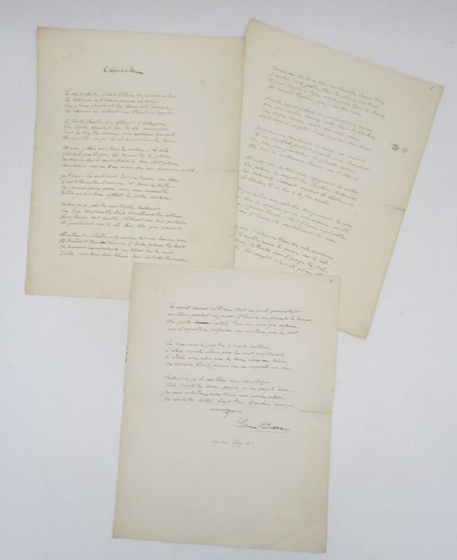 Poème autographe signé intitulé Crépuscule composé de 15 quatrains sur papier gaufré des initiales de l'auteur et peintre natif de l'île de la Réunion. Il comporte de grades différences, bien que le ton et le sujet restent les mêmes, avec la version imprimée, publiée dans le recueil Poèmes et Poésies, paru chez Sausset en 1894. * Membre du SLAM et de la LILA / ILAB Member. La librairie est ouverte du lundi au vendredi de 14h à 19h. Merci de nous prévenir avant de passer,certains de nos livres étant entreposés dans une réserve.
