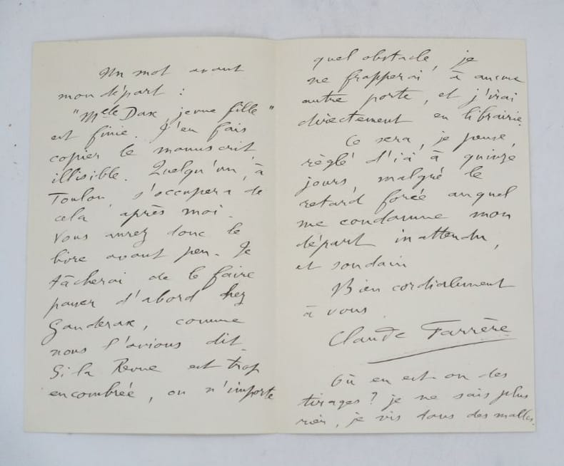 Lettre autographe signée à un destinataire non identifié auquel il annonce son départ pour le Maroc et la fin de la rédaction de son roman Mademoiselle Dax, jeune fille qui paraît chez Ollendorff en 1904. Il compte essayer de placer le texte dans une revue de Louis Ganderax mais s'il n'y est pas publié, il ira "directement en librairie". * Membre du SLAM et de la LILA / ILAB Member. La librairie est ouverte du lundi au vendredi de 14h à 19h. Merci de nous prévenir avant de passer,certains de nos livres étant entreposés dans une réserve.
