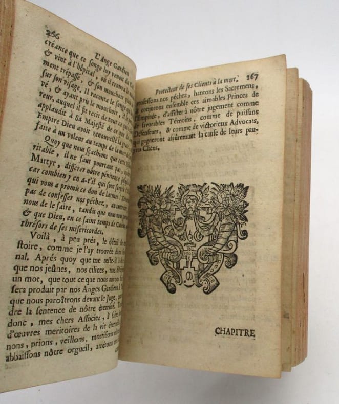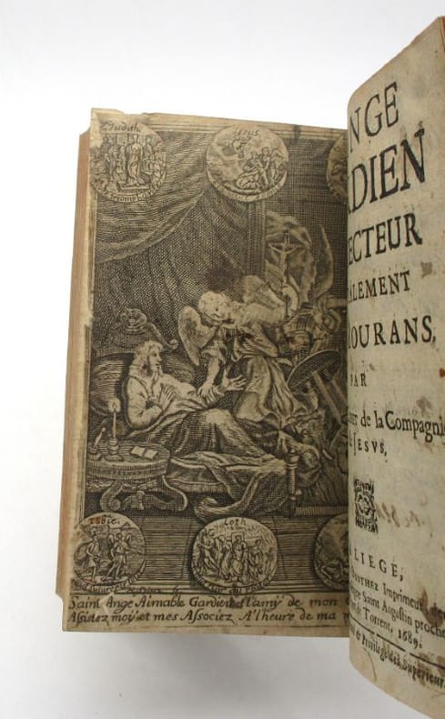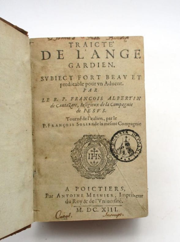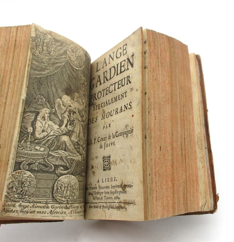 Réunion de trois ouvrages sur les anges gardiens rédigés par des jésuites, dont deux en édition originale traduite. Le premier est l'édition originale de la traduction depuis l'italien par le père François Solier dont l'originale a paru en Italie l'année précédente. Le second est une nouvelle édition dont l'originale a paru en 1662. Le troisième est l'édition originale de la traduction par Feuillet de l'ouvrage du père Drexelius. Le deuxième ouvrage est orné d'un scène représentant un mourant et son ange gardien en frontispice et le troisième comporte une vignette représentant un portrait de Louis XIV porté par deux anges en tête de l'épître dédicatoire. Tampon ex-libris "Séminaires de France", 2 ex-libris manuscrits au titre du premier ouvrage, ex-libris manuscrit Denise Vinot et Louis Durub au second. Annotations anciennes. * Membre du SLAM et de la LILA / ILAB Member. La librairie est ouverte du lundi au vendredi de 14h à 19h. Merci de nous prévenir avant de passer,certains de nos livres étant entreposés dans une réserve.