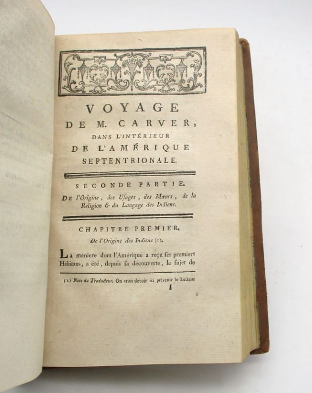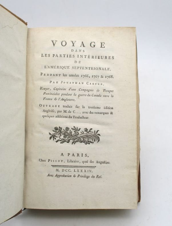 Édition originale de la traduction française de Chanla (pseudonyme de Jean-Étienne Montucla, un mathématicien et polyglotte français) faite sur la troisième édition anglaise. Elle est ornée d'une grande carte dépliante détaillant les routes ainsi que les territoires des divers peuples amérindiens habitant la région. Elle contient également une notice biographique sur Carver, des notes et suppléments du traducteur, un petit dictionnaire français-chippevay, un second français-nadoessis et un guide de la flore et la faune locales. Elle contient la première mention imprimée du nom Oregon, tant dans le texte que sur la carte. Cet ouvrage connut un très grand succès dès sa publication en 1778 et donna lieu à de nombreuses rééditions et traductions. Sabin, Americana, 383, 11188. * Membre du SLAM et de la LILA / ILAB Member. La librairie est ouverte du lundi au vendredi de 14h à 19h. Merci de nous prévenir avant de passer,certains de nos livres étant entreposés dans une réserve.