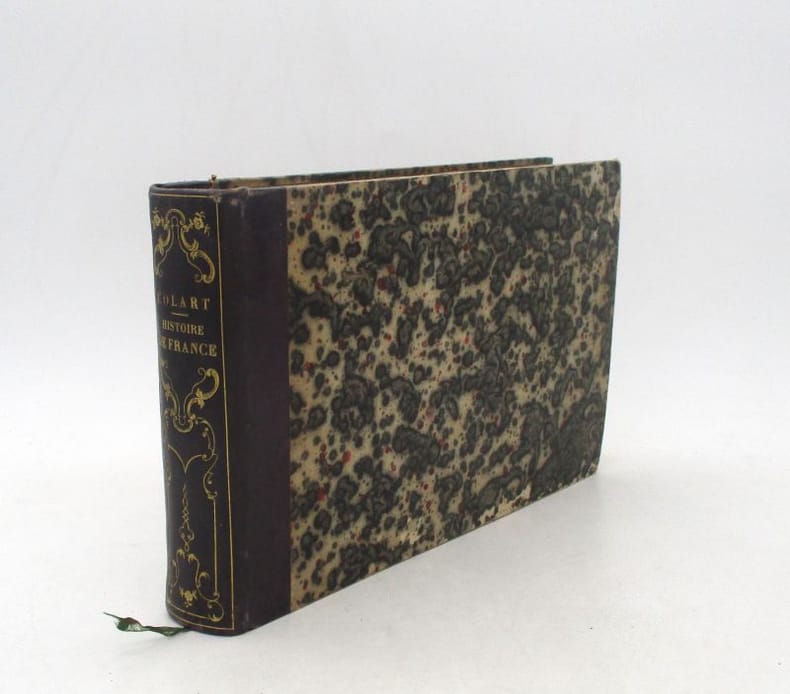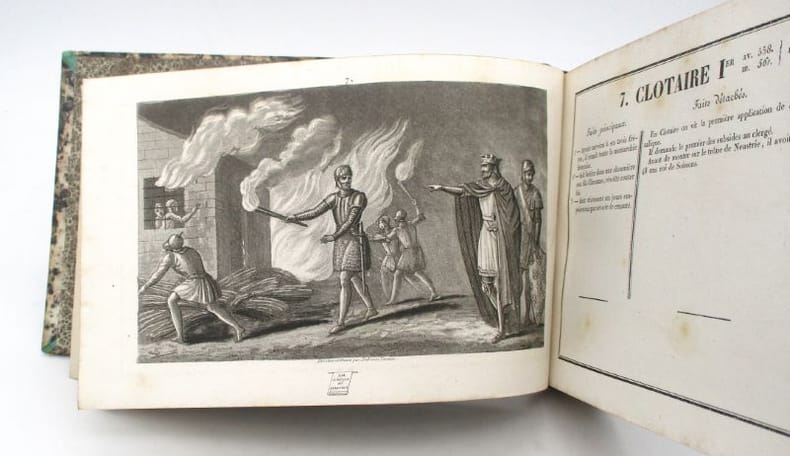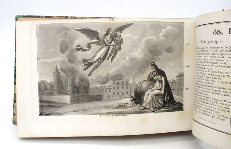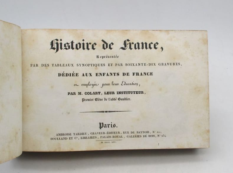 paris Ambroise Tardieu, Boulland et Cie 1825. In-8 oblong contenant 16pp (introduction) 81 feuillets non chiffrés (tableaux synoptiques) 25 feuillets non chiffrés (paroles célèbres, villes et lieux mémorables). Demi basane blonde à petits coins, dos lisse orné de filets, 1 résille et 3 fleurs de lys dorés, pièce de titre rouge. orné d'un grand tableau synoptique récapitulatif dépliant, 1 planche de 70 étiquettes à découper, 70 gravures hors texte illustrant chacune un épisode marquant du règne des Rois de France, de Pharamond à Charles X dont une émouvante gravure représentant Louis XVII. 1 mors fendu sur 1cm environ, coins émoussés, restauration en bordure de 27 planches (plus importante sur la planche n°16). Bien complet du texte, des tableaux, des planches.