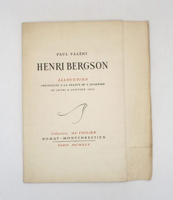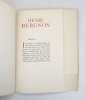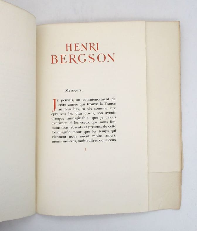 Paris, Editions de la Lampe d’Argile, Georges Servant (Collection Les Quarante), 1928 ; in- , broché, couverture rempliée imprimée rouge et noir ; (1) f. , 101 pp. , (1) f. ;1 portrait en couleurs de Bergson en frontispice, 1 reproduction d’une page autographe de Henri Bergson à pleine page, 4 bandeaux gravés sur bois