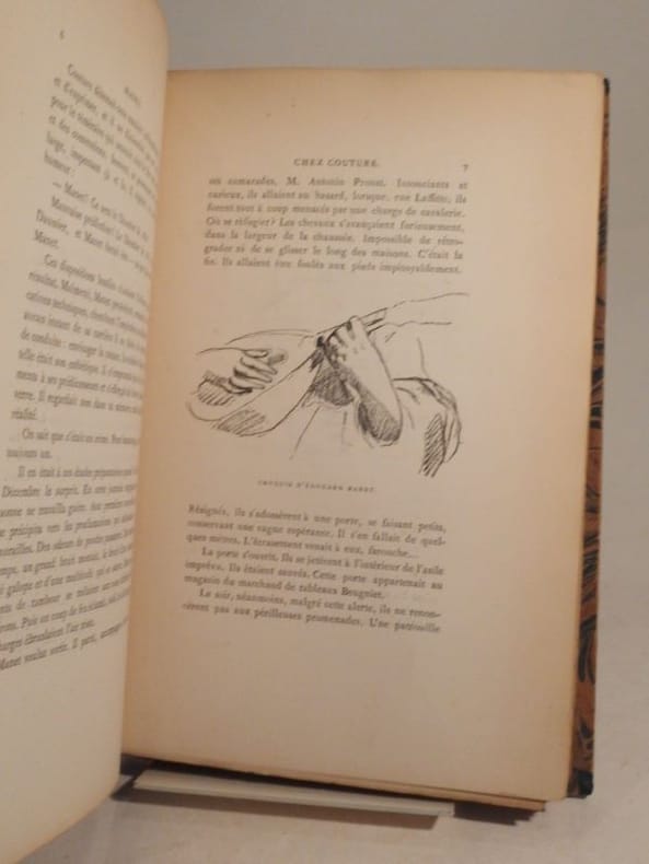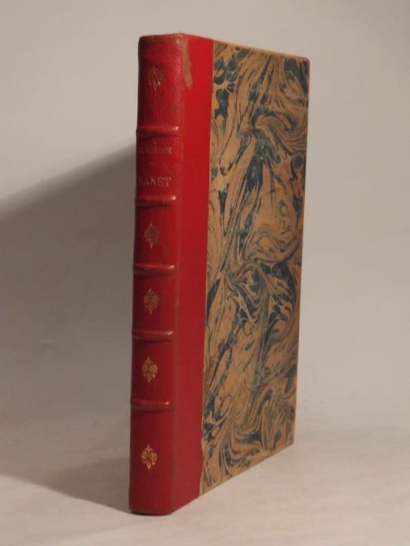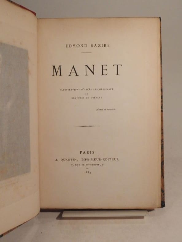 BAZIRE (Edmond). Manet. Paris, A. Quantin, 1884. In-8, édition originale de la première biographie d'Édouard Manet, publiée seulement neuf mois après sa mort, par son ami, Edmond Bazire. Illustrée de nombreuses compositions in-texte, d'un fac-similé d'une lettre de Manet à Madame Guérard, de 3 eaux-fortes de H. Guérard et 6 héliogravures d'après des oeuvres de Manet et de 2 eaux-fortes originales d'Édouard Manet ("L'Odalisque" et "La convalescente") Reliure demi-maroquin marron foncé à coins, dos à 5 nerfs, les caissons ornés d'un fer à la palette de peintre, titre, auteur et date dorés, couvertures conservées, signée L. Feuillet. Belle et rare édition, bien complète des deux superbes eaux-fortes originales de l'artiste, encore plus désirable en reliure signée. (quelques frottements à la reliure, notamment aux nerfs, petite bande de rousseurs en marge de "La femme au carlin" et "Argenteuil")