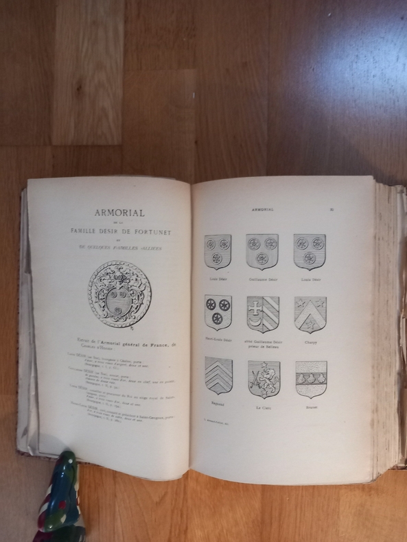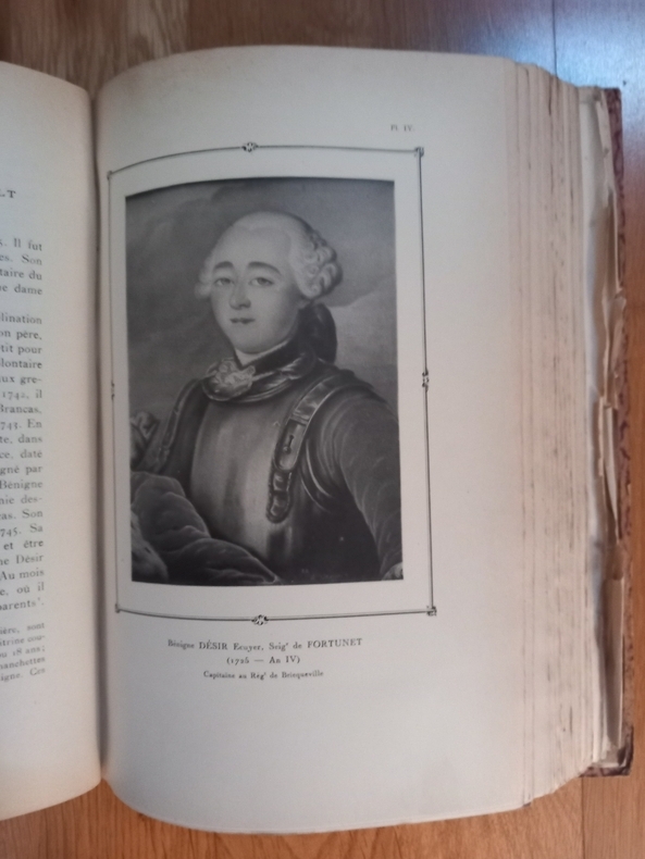 Un volume factice in 4°(155x245), reliure bradel papier moucheté, pièce de titre basane, comprenant: 1°. une plaquette de 44pp. et 4 grandes planches généalogiques dépliantes. Couverture sans titre décorée d'un sceau. 2°. un ouvrage de xiii (iv pp. d'armorial) et 356pp., 18 grandes planches généalogiques dépliantes. Couvertures imprimées.32pl h.t (portraits).