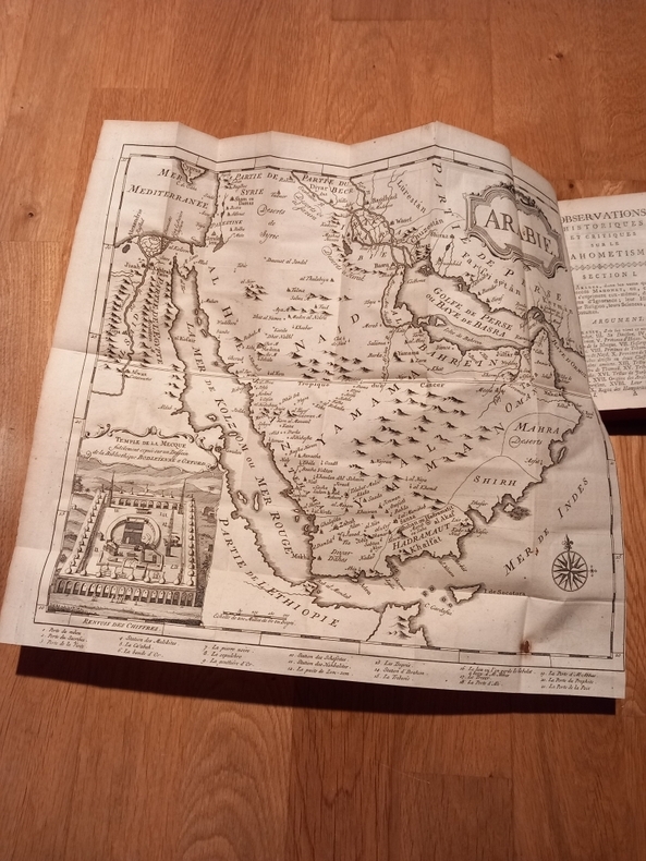 Deux vol. in 12° reliés plein veau moucheté. Dos à cinq nerfs, orné. Tranches rouges. Frontispice , deux pl. dép. (carte de L'Arabie -Plan et vue du temple de la Mecque) et trois tables généalogiques. XVIII-472 ( et 476) pp. Titres en noir et rouge. Étiquette de libraire collée à l'envers(?) sur le dernier contre-plat: "se vend à Bordeaux, chez P. Gauvry, libraire, rue Saint-James, près du Grand-Marché".