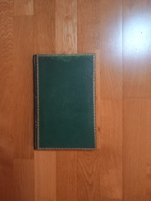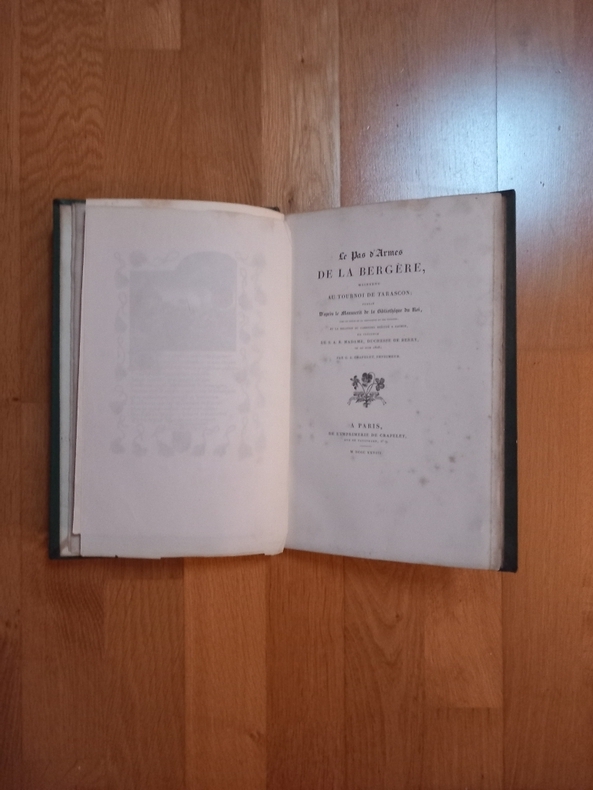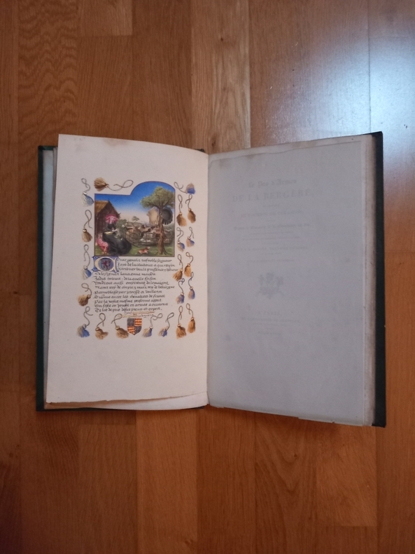 Vol. in quarto (180x285) relié. Dos plat maroquin vert sombre décoré d'encadrements de filets dorés. Plats de percaline gaufrée verte encadrés d'un guirlande de petites fleurs, roulette et filet dorés. IV-150 pp. En frontispice, fac-simile de la miniature du manuscrit original.