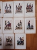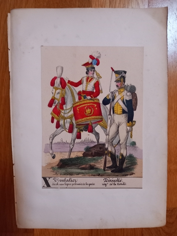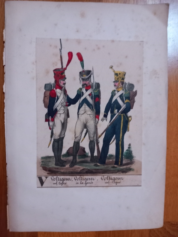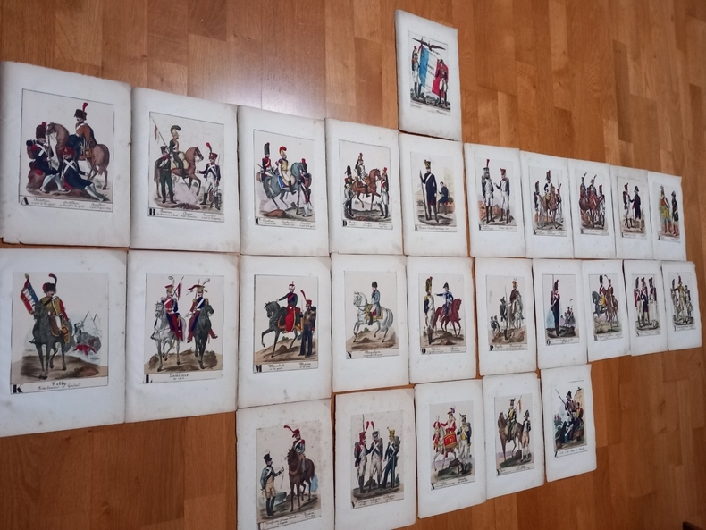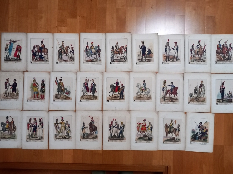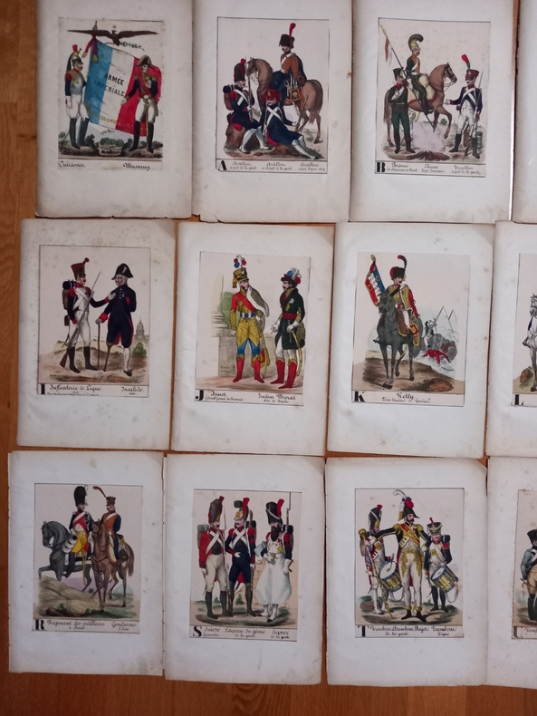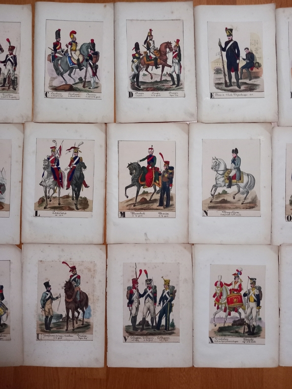 25 planches 1250x1750 gravées et coloriées, contrecollées sur du papier provenant de la "Commission des Monnaies et Médailles"(?). Titre et vingt-cinq lettres de l'alphabet: -(Titre) Armée Impériale. -A artilleur à pied de la garde... -B bivouac de chasseurs à cheval... -C carabinier à cheval de 1805... -D dragon (sapeur)... -E élèves de l'Ecole Polytechnique, 1812. -F fusilier, grenadier de la garde... -G grenadier à pied de la garde... -H hussard... -I infanterie de ligne, 1814... -J Junot, Colonel Général des Hussards... -K Ketly, porte-étendard de Guideal. -L lanciers de 1814. -M mameluck... -N Napoléon, Empereur des Français. -O officier des grenadiers de la garde... -P pupille de la garde... -Q Qui vive?... -R régiment des artilleurs à cheval... -S suisse grenadier... -T tambour et tambour major de la garde... -U uniforme du train d'artillerie de la garde... -V voltigeur inf. légère... -X timbalier(?) des ch. légers polonais de la garde... -Y Yvon lancier polonais 1812... -Z zèle d'une sœur de charité. Pas de W (oublions Waterloo!).