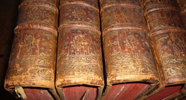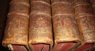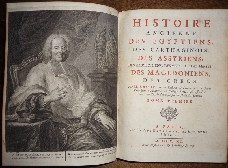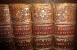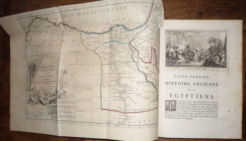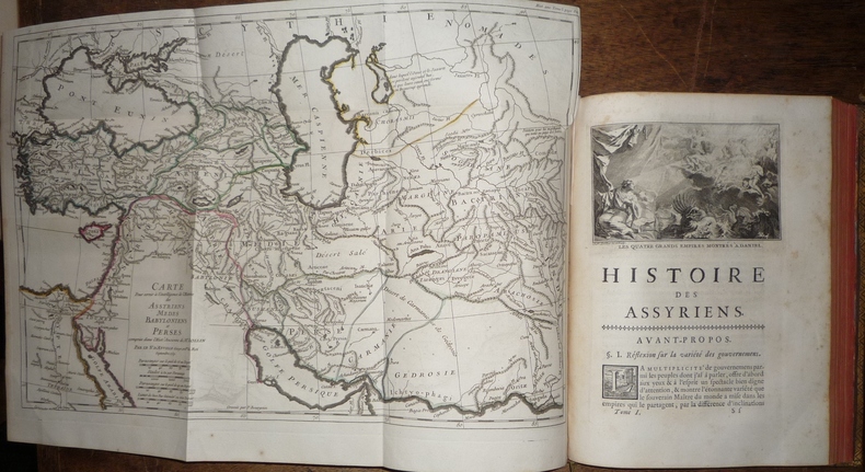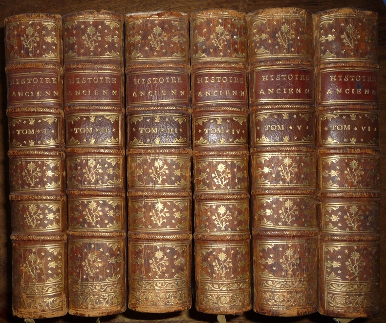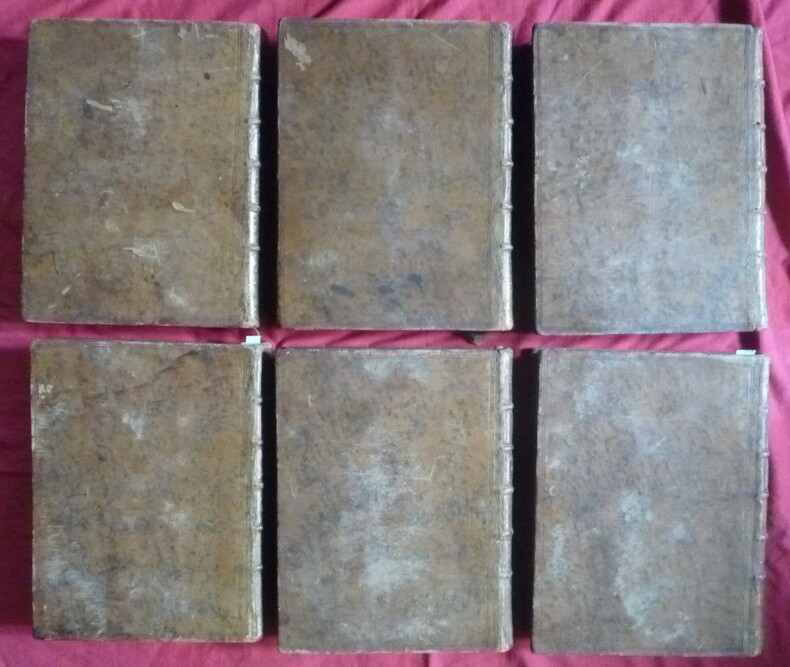 A Paris chez la veuve Estienne. 1740. 6 volumes de format in-4° 20 x 25,5 cm. reliures plein veau d'époque.Dos à 5 nerfs richement ornés à motifs dorés, pièce de titre et de tomaison en maroquin rouge, gardes marbrées, tranches rouges, filets dorés sur les coupes, ex-libris de J.B Valentin. Tome 1 : 54 pages d'épitre et de préface + 582 pages illustré d'un frontispice (portrait de l'auteur), de 5 cartes dépliantes et de 4 vignettes gravées (en tête de chaque partie). Tome 2 : 726 pages, illustré de 4 cartes dépliantes et de 5 vignettes gravées (en tête de chaque partie). Tome 3 : 842 pages, illustré de 4 cartes dépliantes et de 6 vignettes gravées (en tête de chaque partie). Tomes 4 : 720 pages, illustré de 3 cartes dépliantes et de 4 vignettes gravées (en tête de chaque partie). Tome 5 : 864 pages, illustré de 6 vignettes gravées (en tête de chaque partie) et 2 gravures pleine page : architecture et "camp des romains". Tome 6 : 816 pages, illustré de 4 vignettes gravées (en tête de chaque partie). Edition originale, ornée de 16 cartes dépliantes et 2 gravures, quelques coiffes abîmées (une est arrasée), traces de frottements sans conséquence (voir photos), certains angles semblent avoir été consolidés (colle de farine ?) rares rousseurs , quelques feuillets brunis, tous les cahiers sont bien alignés, mors solides peu usés. Bel exemplaire en reliure d'époque en bon état.