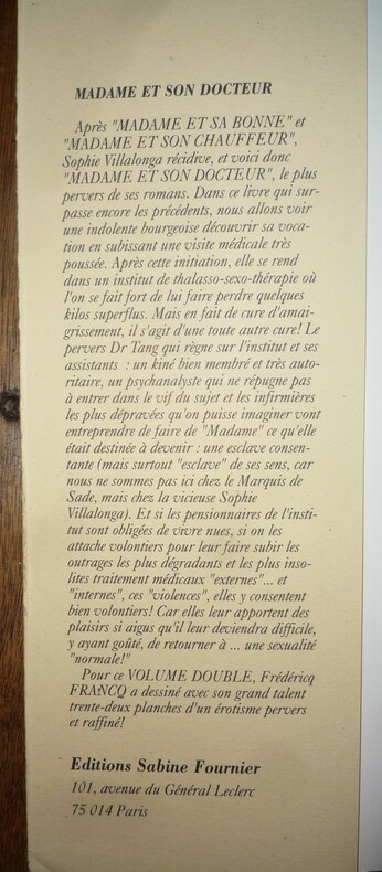Editions Sabine Fournier - 1996. collections "Les Aphrodisiaques" format : 13,5 x 21.5 cm, couverture rempliée, 398 pages illustrées d'une trentaine de dessins érotiques très libres pleine page signés : Fredericq Francq. Bon état