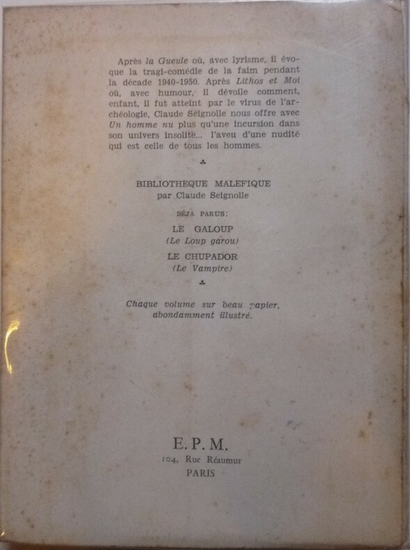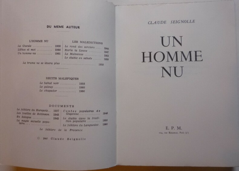 éditions E.P.M. - 1961. belle dédicace autographe signée de l'auteur en page de faux-titre. format : broché, 14.5 x 19 cm, couverture rempliée, 196 pages. quelques rousseurs sur la couverture et sur les tranches sinon bon état je vends d'autres ouvrages de Claude Seignolle en provenance de la même bibliothèque dont certains avec envoi.