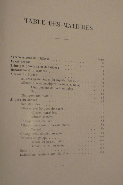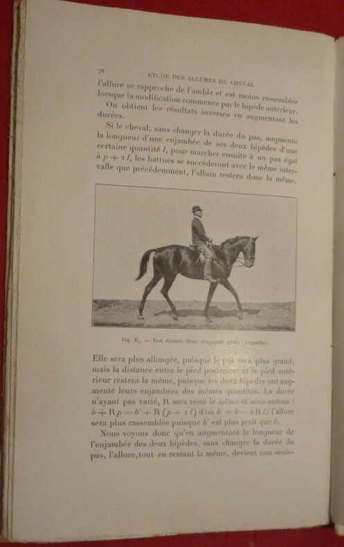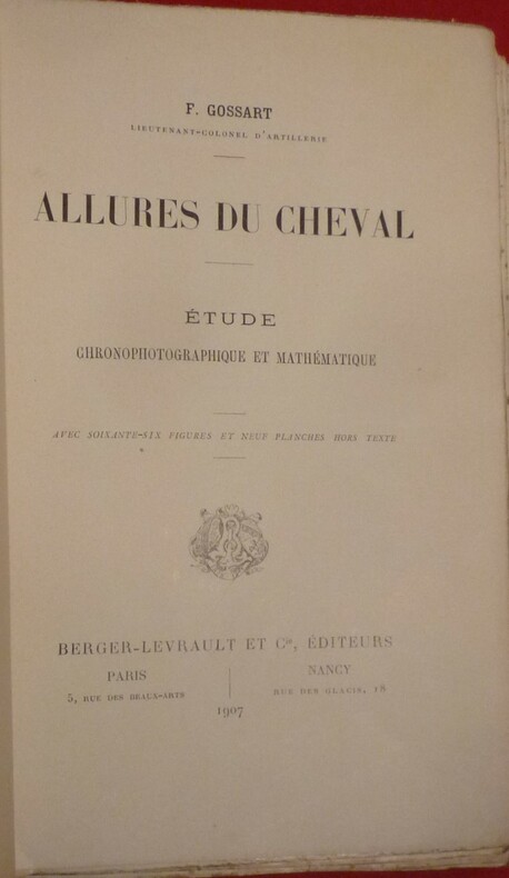La première édition est de 1896. L'ouvrage se concentre surtout sur la représentation artistique du cheval et la différence des conventions de cette dernière avec ce que révélait la chronophotographie (alors toute jeune discipline) sur les mécanismes réels de l'allure.Mennessier de La Lance I, 588. - - VENTE PAR CORRESPONDANCE UNIQUEMENT - LIEN DE PAIEMENT, NOUS CONSULTER.