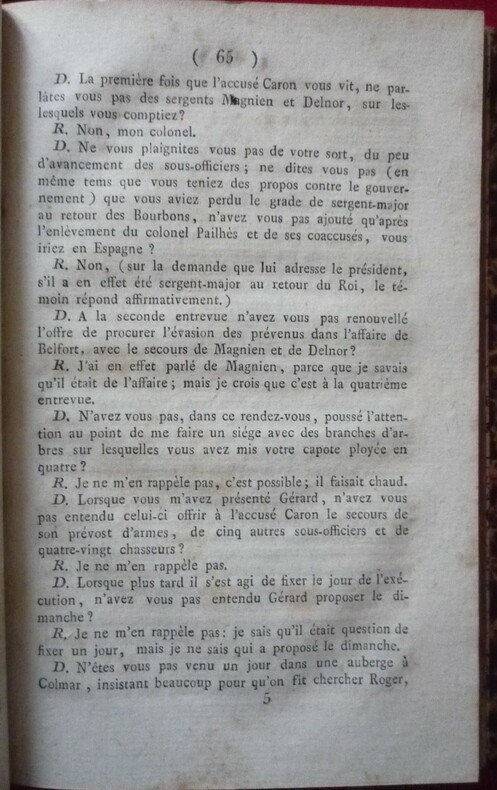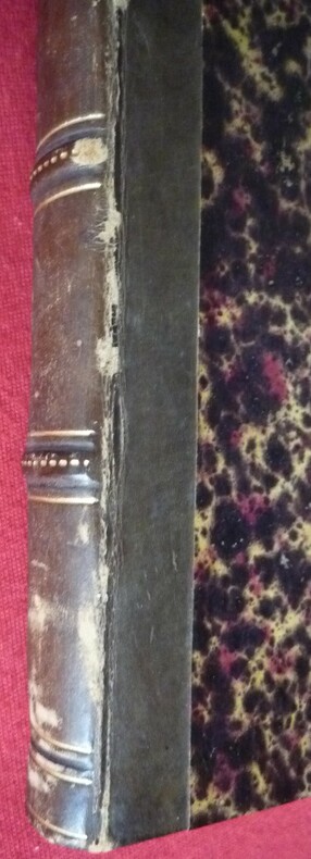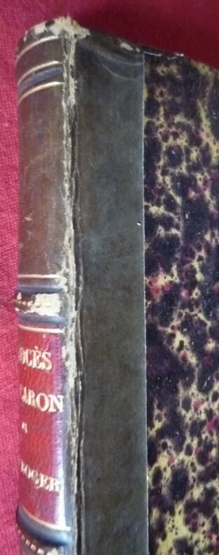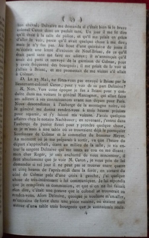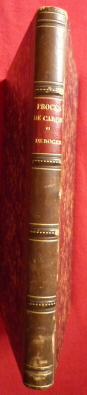 Procès d'Augustin-Joseph Caron lieutenant-colonel en retraite, et de Frédéric-Dieudonné Roger écuyer ; tous deux domiciliés à Colmar traduits le 18 septembre 1822 devant le conseil de guerre permanent, de la 5 ième division militaire, séant à Strasbourg pour crime d'embauchage. imprimé à Strasbourg chez Jean-Henri Heitz. Format : 12.5 x 19 cm, reliure demi-basane postérieure (vers 1840), dos à 4 nerfs, plats et gardes marbrés, tranches rouges, 208 pages. Rousseurs, marques de frottements sur le cuir sinon bon état