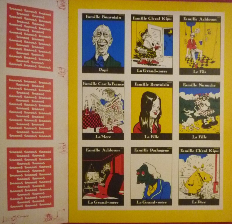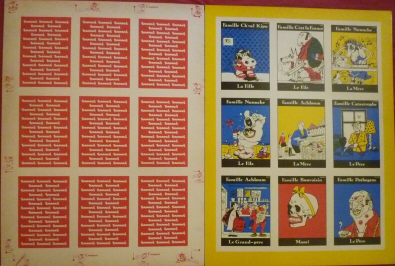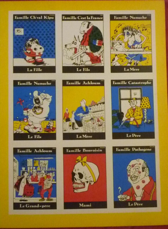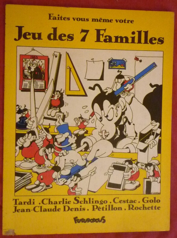éditions Futuropolis - 1983. format : 24 x 32 cm,8 feuillets cartonnés , ouvrage destiné à confectionner un jeu de 7 familles composées de 6 cartes chacune et d'une boite à fabriquer. les cartes sont illustrées par Tardi, Schlingo, Cestac, Golo, Pétillon, Rochette et J.C. Denis couverture un peu poussiéreuse un petit accroc en bas du premier plat, sinon bon état et bien complet