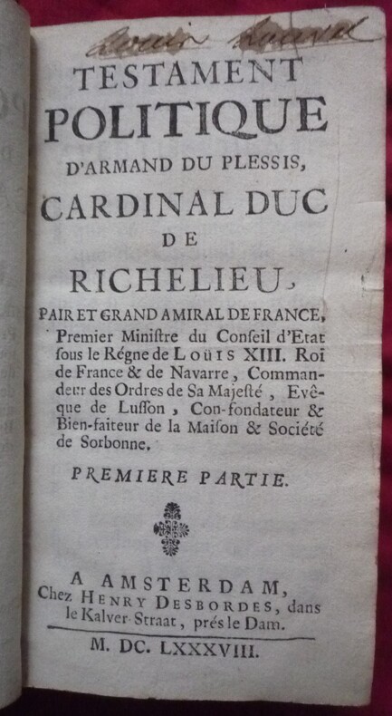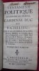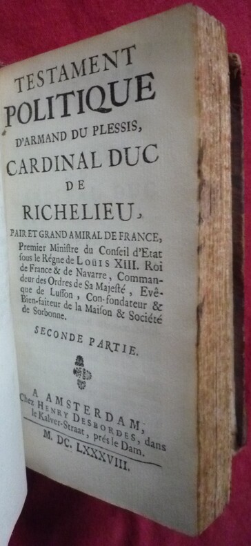 Nouvelle édition enrichie (la plus complète) et établie par François-Louis-Claude MARIN (censeur royal de la Librairie, de la Police et des Théâtres) à partir des quatre manuscrits conservés. On trouve à la fin du second tome la "Lettre" par E. Lauréault de Foncemagne qui vient contester le jugement de Voltaire sur le texte de Richelieu ("Des mensonges imprimés" 1749). Le portrait est gravé sur cuivre par Nicolas Dupuis d'après la peinture de Philippe de Champaigne. Les deux premières parties sont ornées en tête d'un bandeau aux armes du cardinal et d'une lettre ornée, gravés sur cuivre. Vignettes gravées sur bois au titre de chaque partie. La première édition avait été donnée par Desbordes à Amsterdam en 1688.