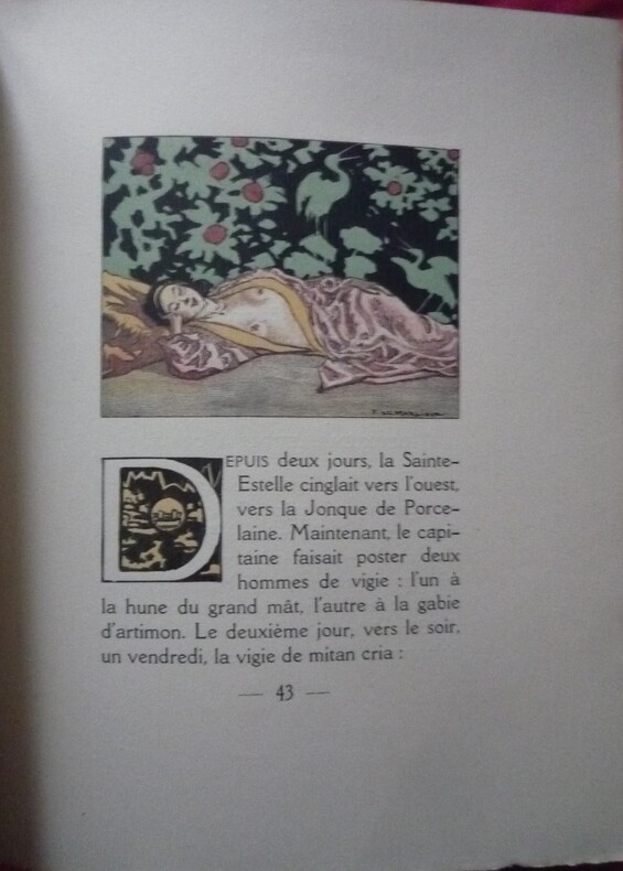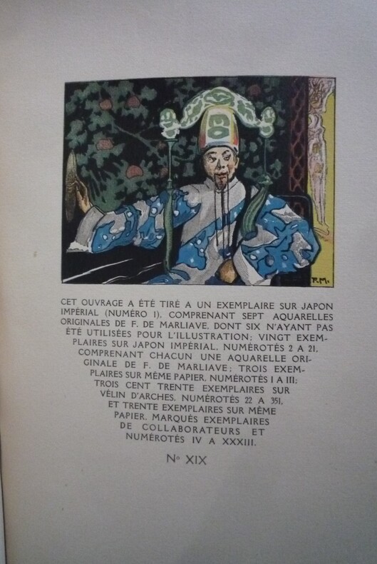 illustrations de François de Marliave gravées sur bois en plusieurs couleurs par E. Gaspérini éditions Grasset – 1927. tirage limité à 381 exemplaires, un des XXX exemplaires réservés aux collaborateurs. format 17,5 x 22,5 cm, broché, couverture rempliée, 224 pages, superbement illustrées. Dos taché, quelques marques sur la couverture (voir photos), une marque de pli sur l'angle du premier plat, tête poussiéreuse, sinon bel état, intérieur très frais sans rousseurs.