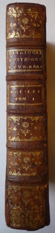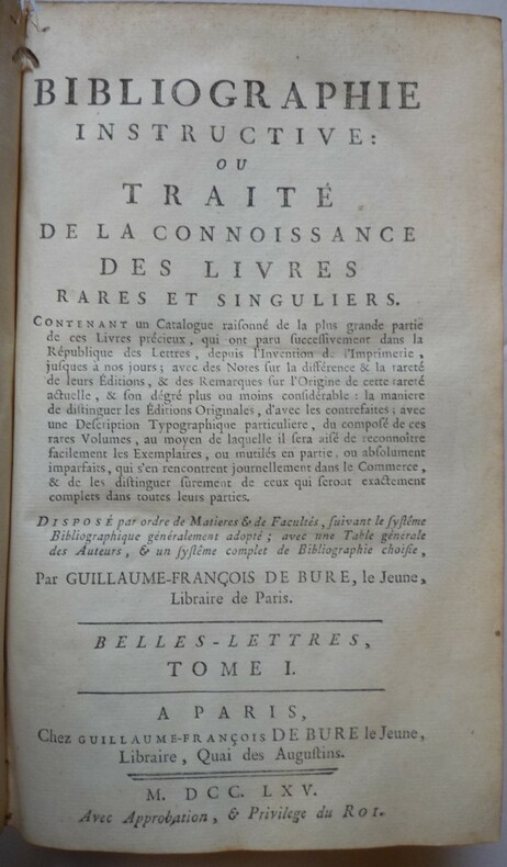 Paris, Guillaume-François de Bure le Jeune, Libraire, 1764 ; in-8, XXVIII-772-2, relié plein cuir, dos orné à 5 nerfs, pièces de titre rouge et brun, tranches ocre rouge (couverture détachée du dos, frottements et épidermures). Contenant un Catalogue raisonné de la plus grande partie de ces Livres précieux, qui ont paru successivement dans la République des Lettres, depuis l'Invention de l'Imprimerie, jusques à nos jours; avec des Notes sur la différence et la rareté de leurs Éditions, et des Remarques sur l'origine de cette rareté actuelle, et son degré plus ou moins considérable: la manière de distinguer les Éditions Originales, d'avec les contrefaites, avec une Description Typographique particulière du composé de ces rares Volumes, au moyen de laquelle il sera aisé de reconnaître facilement les Exemplaires, ou mutilés en partie, ou absolument imparfaits, qui s'en rencontrent journellement dans le Commerce, et de les distinguer surement de ceux qui seront exactement complets dans toutes leurs parties. Disposé par ordre de Matières et de Facultés, suivant le système Bibliographique généralement adopté; avec une Table générale des Auteurs, et un système complet de Bibliographie choisie.